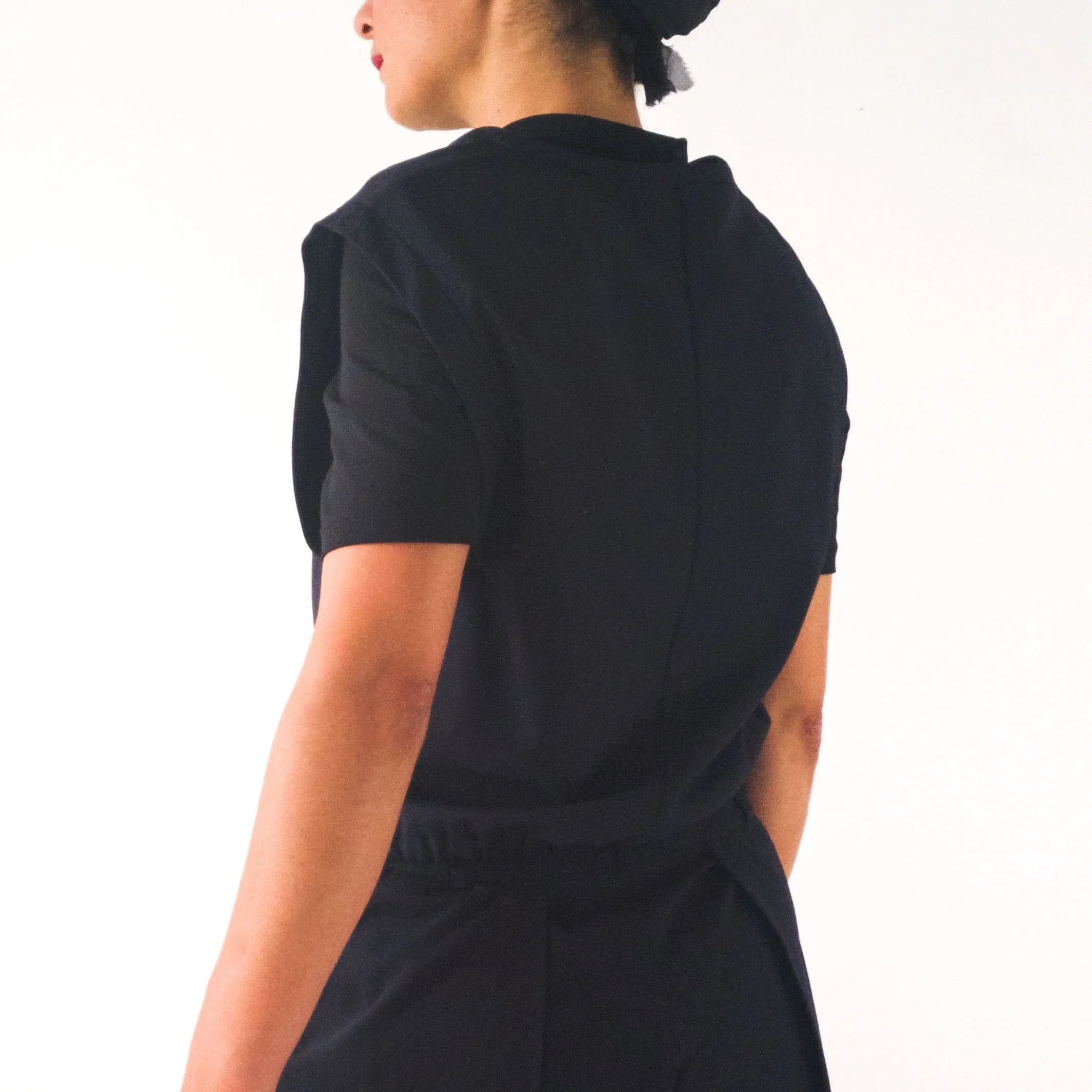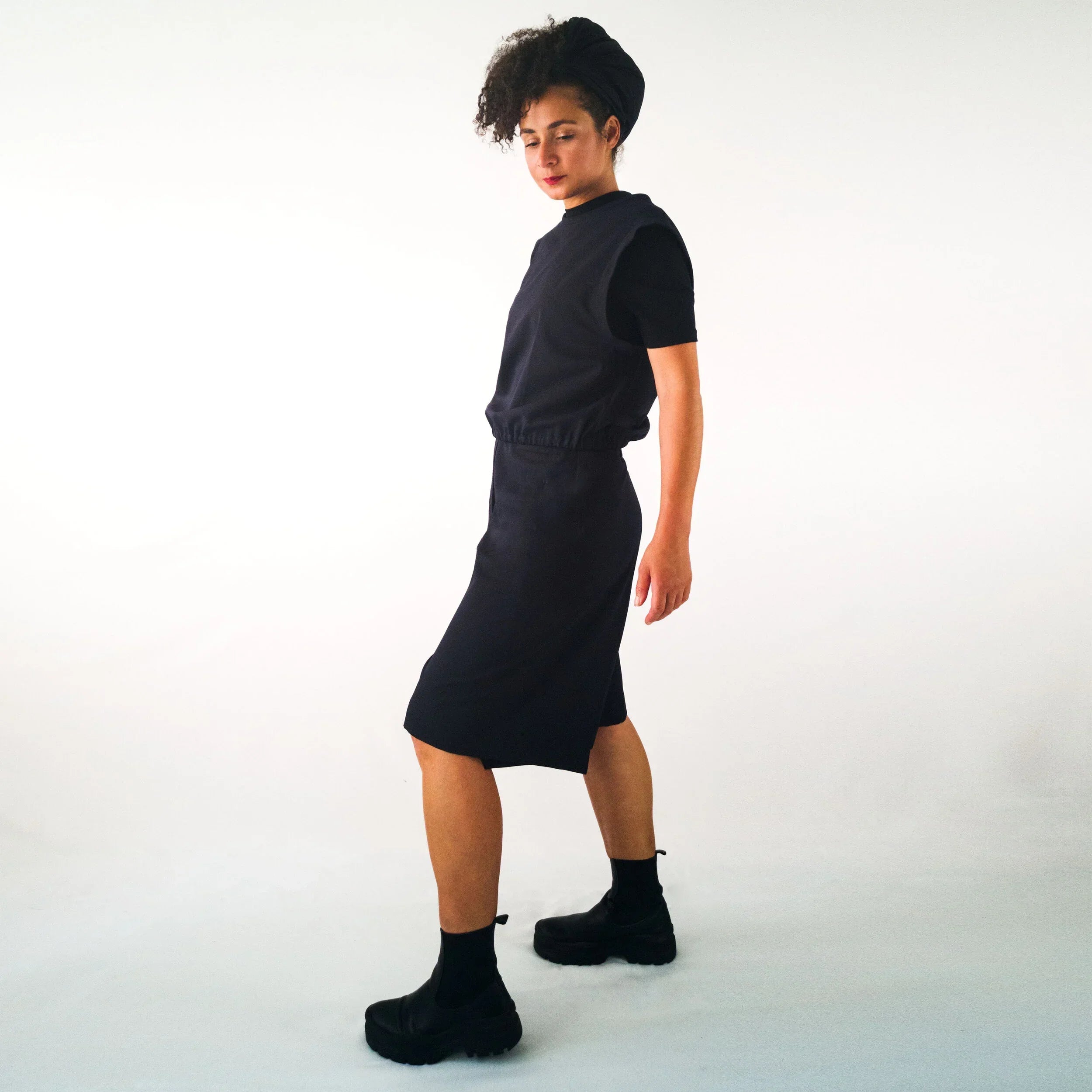 The deep armhole , the short sleeves and the narrow elastic cuffs create a balanced play between severity and lightness - a statement of minimalist fashion, made in Berlin-Kreuzberg .