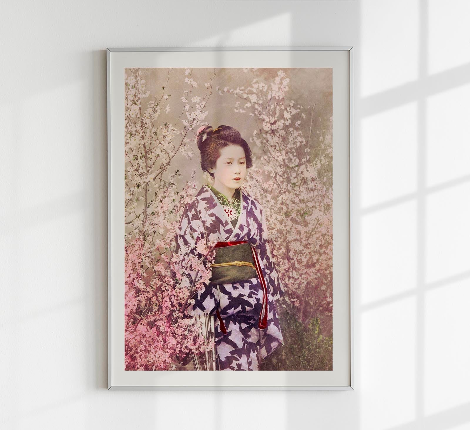 Als Fine Art Print mit optionaler Canvas-Variante überträgt das Motiv die subtile Kolorierung und den leicht nostalgischen Charakter der Originalaufnahme in hochwertige Wandkunst. Die Kombination aus Geisha-Porträt und Sakura-Blüte schafft eine ruhige, poetische Bildwirkung, die besonders in fein gestalteten Wohn- und Ruhebereichen wirkt.