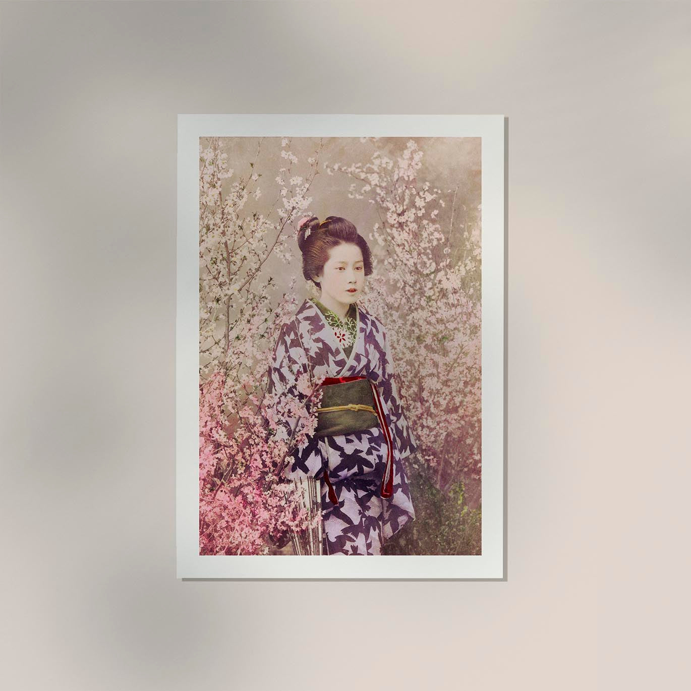 Die Kombination aus samtig-mattem Fine Art Papier mit hoher Grammatur und archivtauglichen Pigmenttinten sorgt für eine differenzierte Wiedergabe der handkolorierten Töne, Kimonostrukturen und feinen Blütenkonturen. Optional betont eine fein strukturierte Canvas-Oberfläche den objekthaften, fast malerischen Charakter der historischen Fotografie und lässt das Motiv wie ein eigenständiges Japan-Art-Objekt wirken. Oberflächen-/Bediengefühl: blendfrei, angenehm glatt-griffig – ideal für gerahmte Hängungen bei weicher, indirekter Beleuchtung.