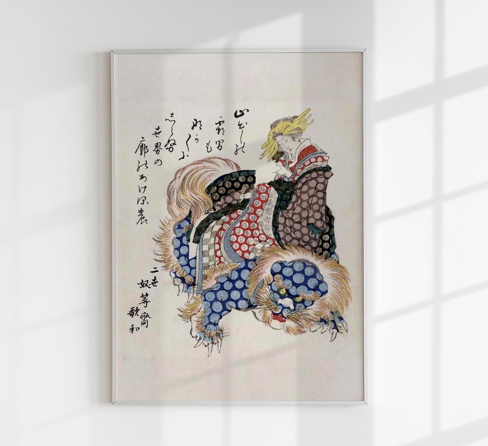 Woman Riding a Sishi by Totoya Hokkei – Japanische Kunst | Fine Art Print | Edo-Ästhetik