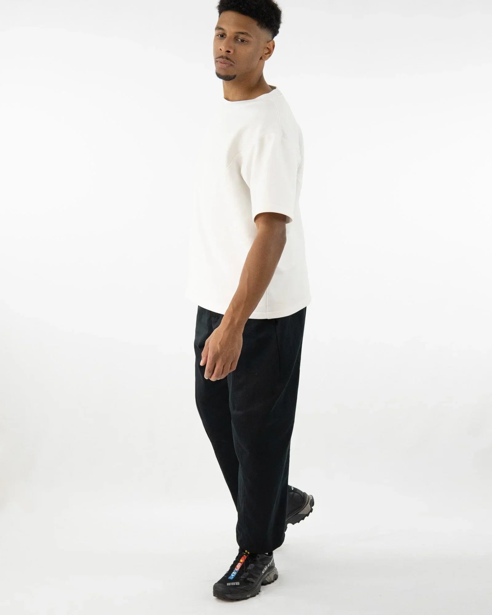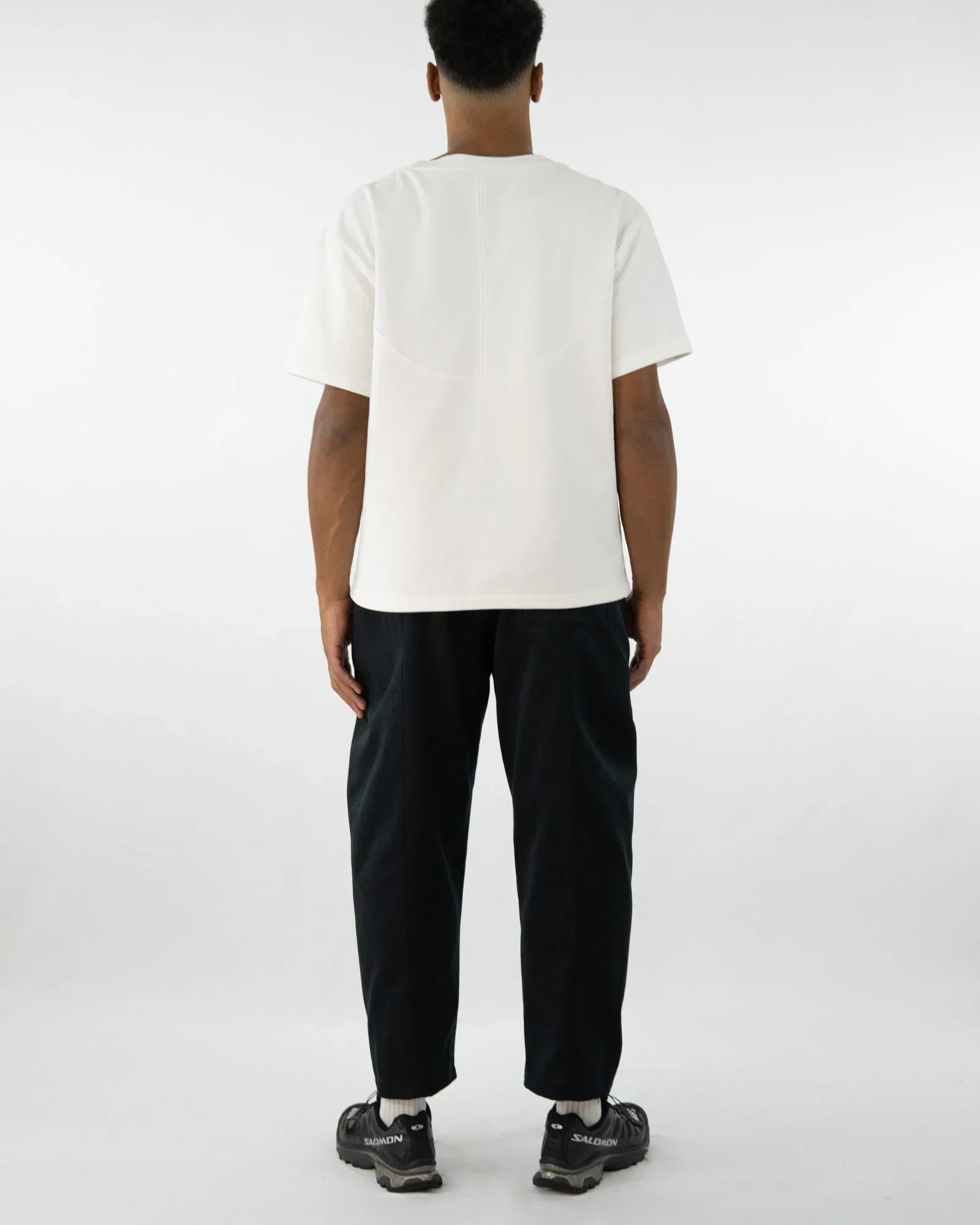 The AdoTHOM trousers combine Japanese-inspired design with functional everyday practicality. Their elastic waistband ensures a comfortable fit, while the wide leg with a tapered silhouette creates a modern look. Quilted dividing seams, a patch back pocket, and a concealed button complete the minimalist, clean look.