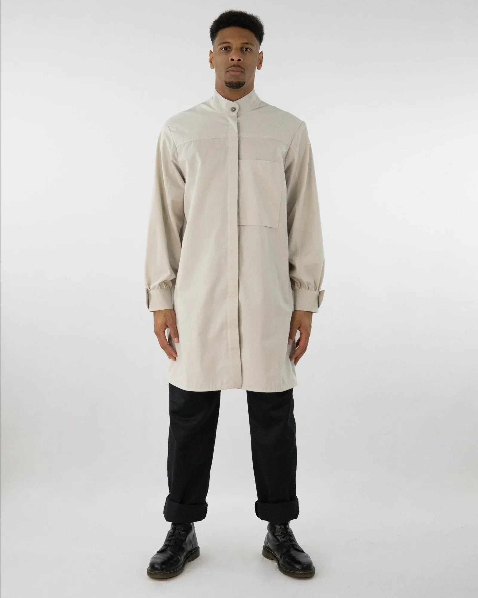 The NOBUO Light shirt is a signature piece by Keijn—designed for all genders . The loose, flowing cut combines comfort with modern ease. A striking stand-up collar lends a confident presence, while the minimalist breast pocket , cleverly integrated into the concealed button placket , emphasizes the understated character.