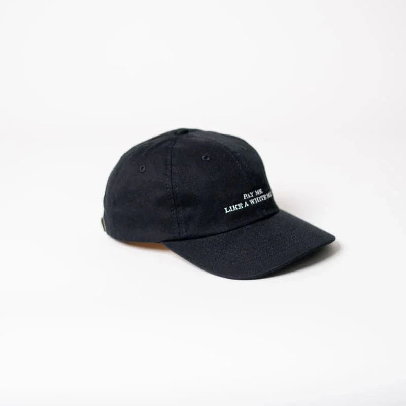 The "Pay me like a white man" dad cap makes a clear statement – against discrimination, for fairness.