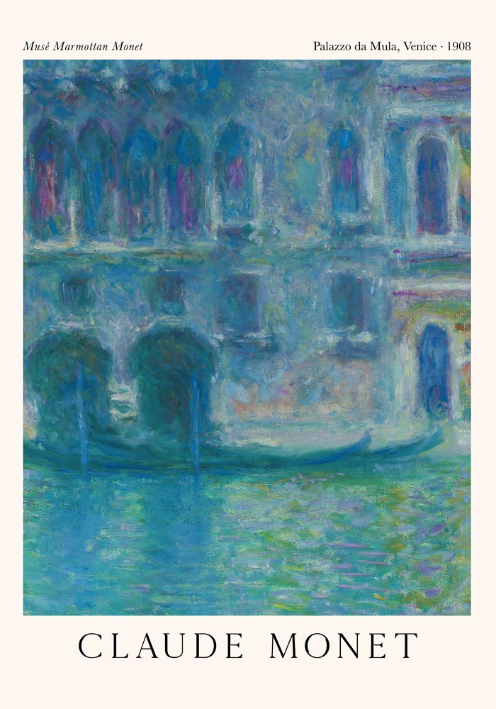 Das Palazzo da Mula, Venice by Claude Monet Exhibition Poster ist eine Hommage an den Impressionismus und an Monets unverwechselbare Fähigkeit, Licht in Bewegung zu verwandeln. Das Motiv zeigt den venezianischen Palast in schimmernden Rosé-, Blau- und Goldtönen – ein Sinnbild für Ruhe, Eleganz und zeitlose Kunst.