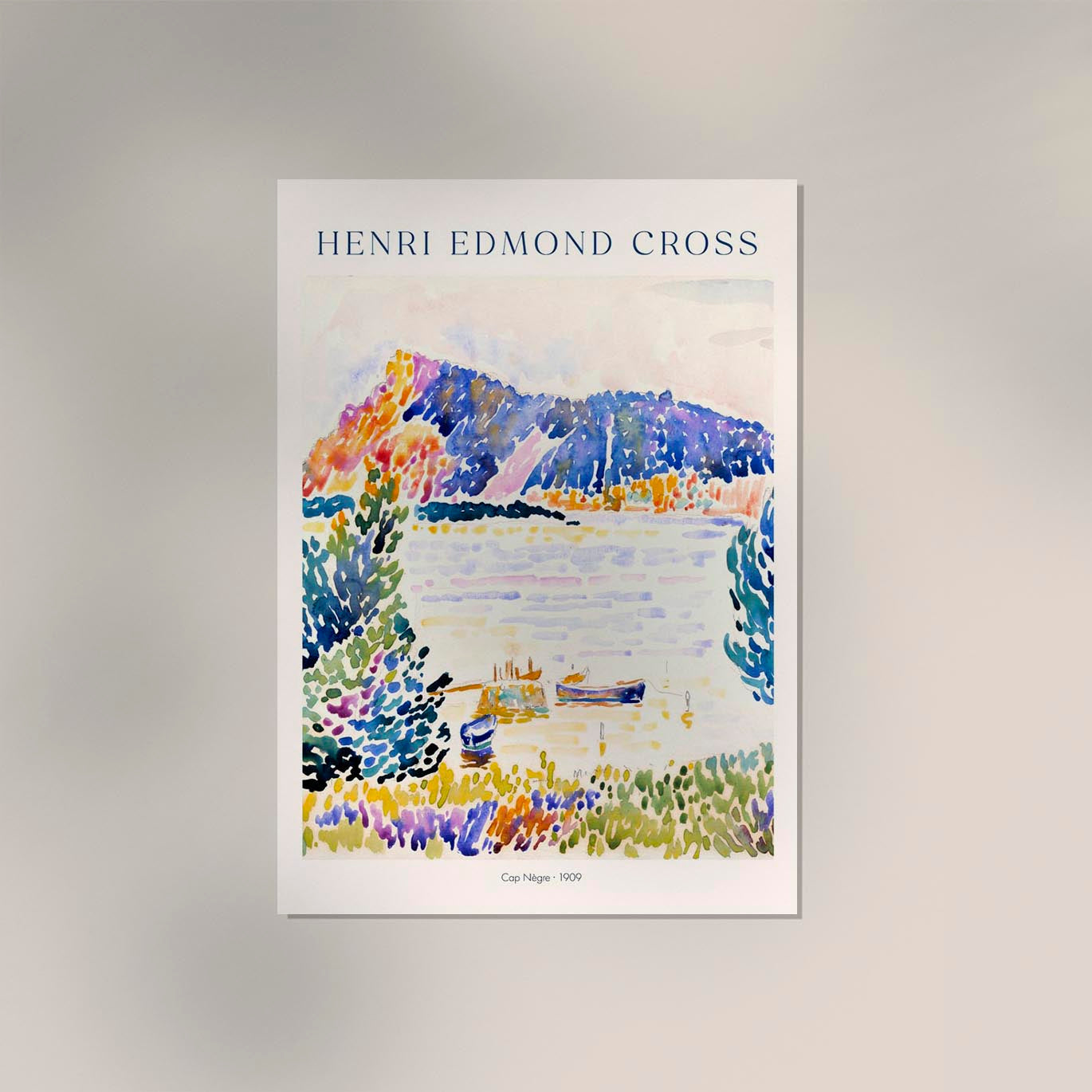 Das Cap Negre by Henri Edmond Cross Exhibition Poster zeigt die mediterrane Küstenlandschaft am Cap Nègre mit türkisem Meer, warmen Felsklängen und Pinien – inszeniert in leuchtenden, neoimpressionistischen Farbfeldern.