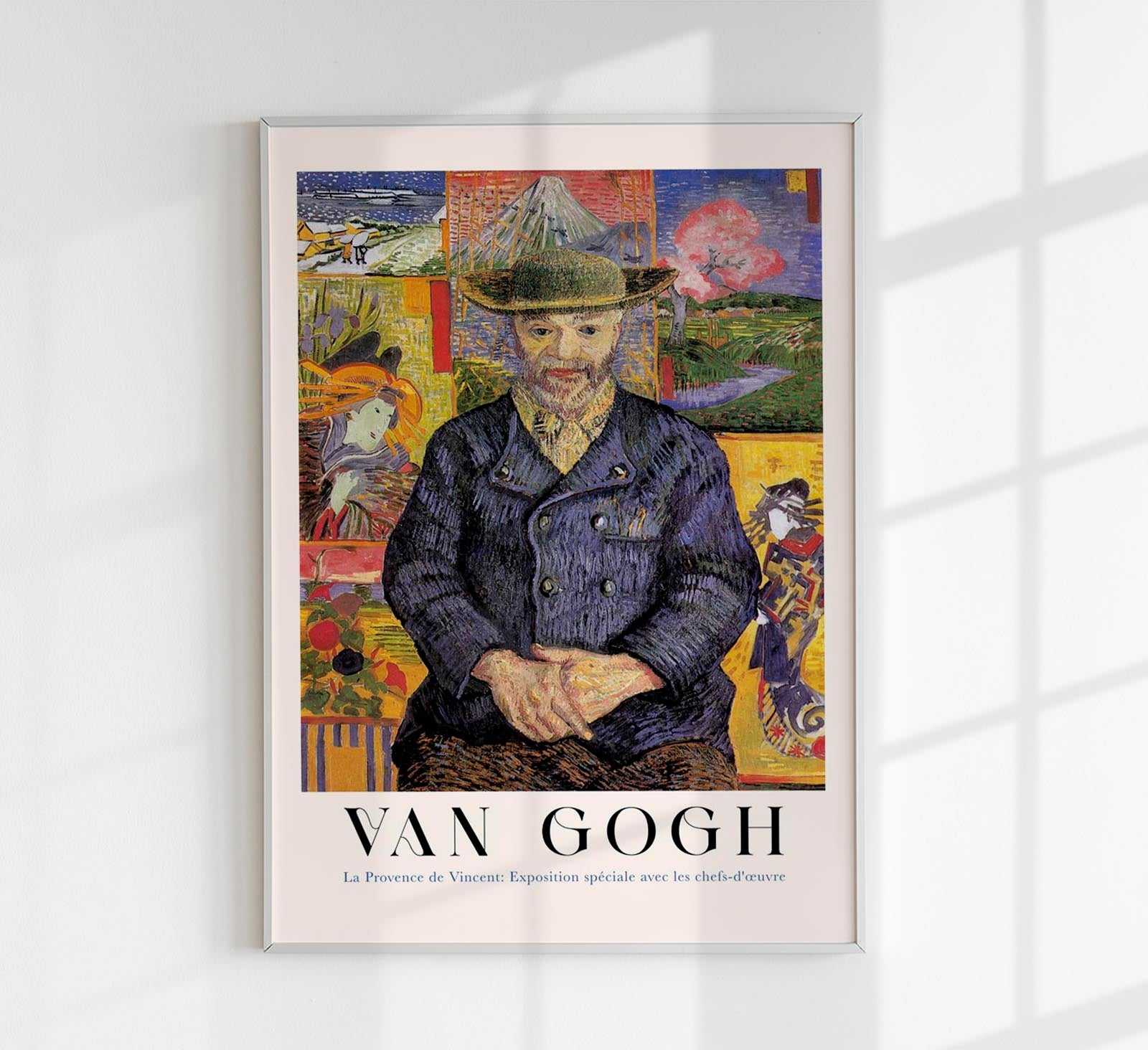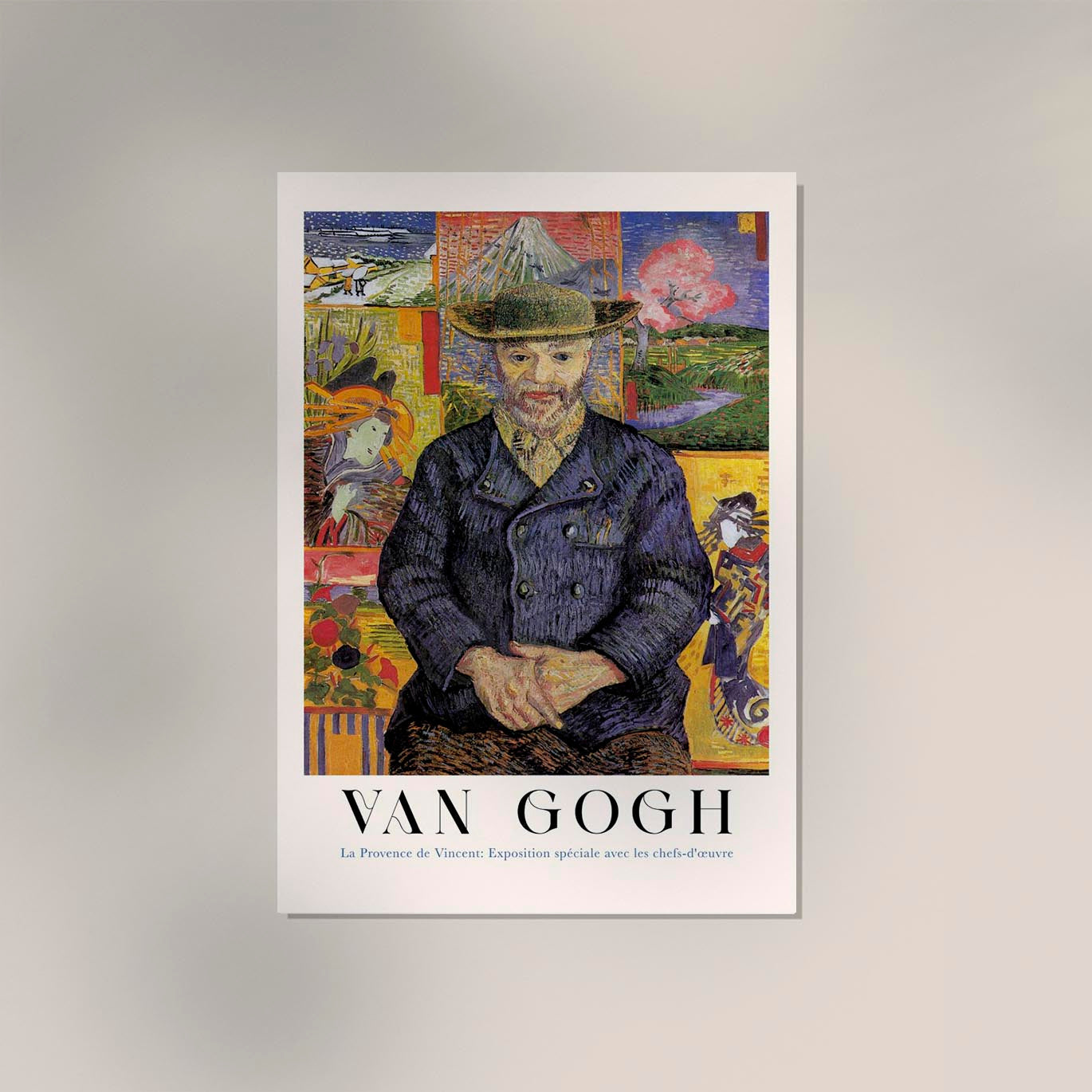Das Portrait of Père Tanguy Exhibition Art Poster zeigt Vincent van Goghs ikonisches Porträt seines Pariser Mentors Julien Tanguy – ein Sinnbild für Gelassenheit, Menschlichkeit und leuchtende Farbkompositionen.