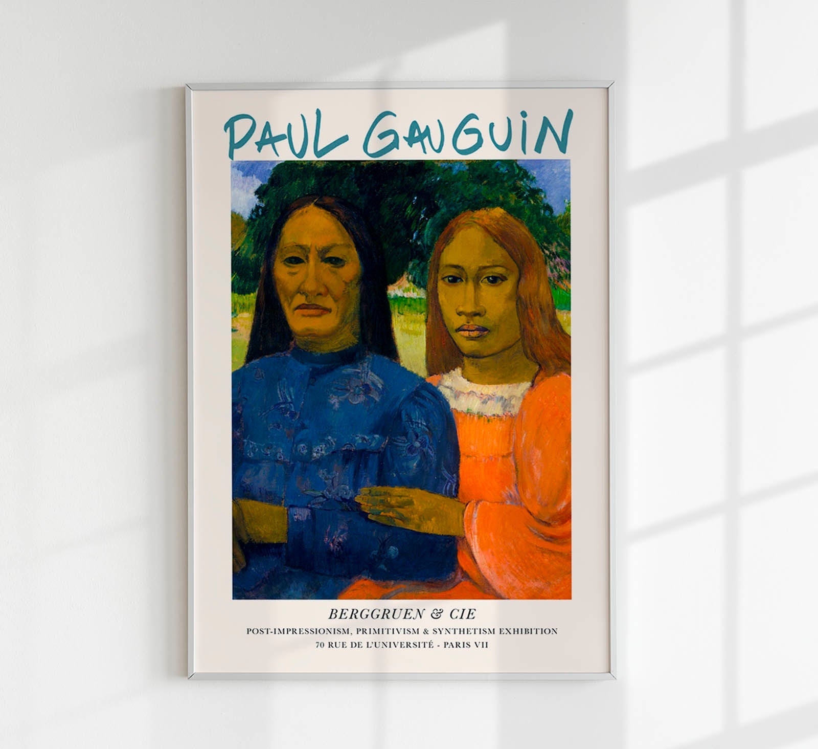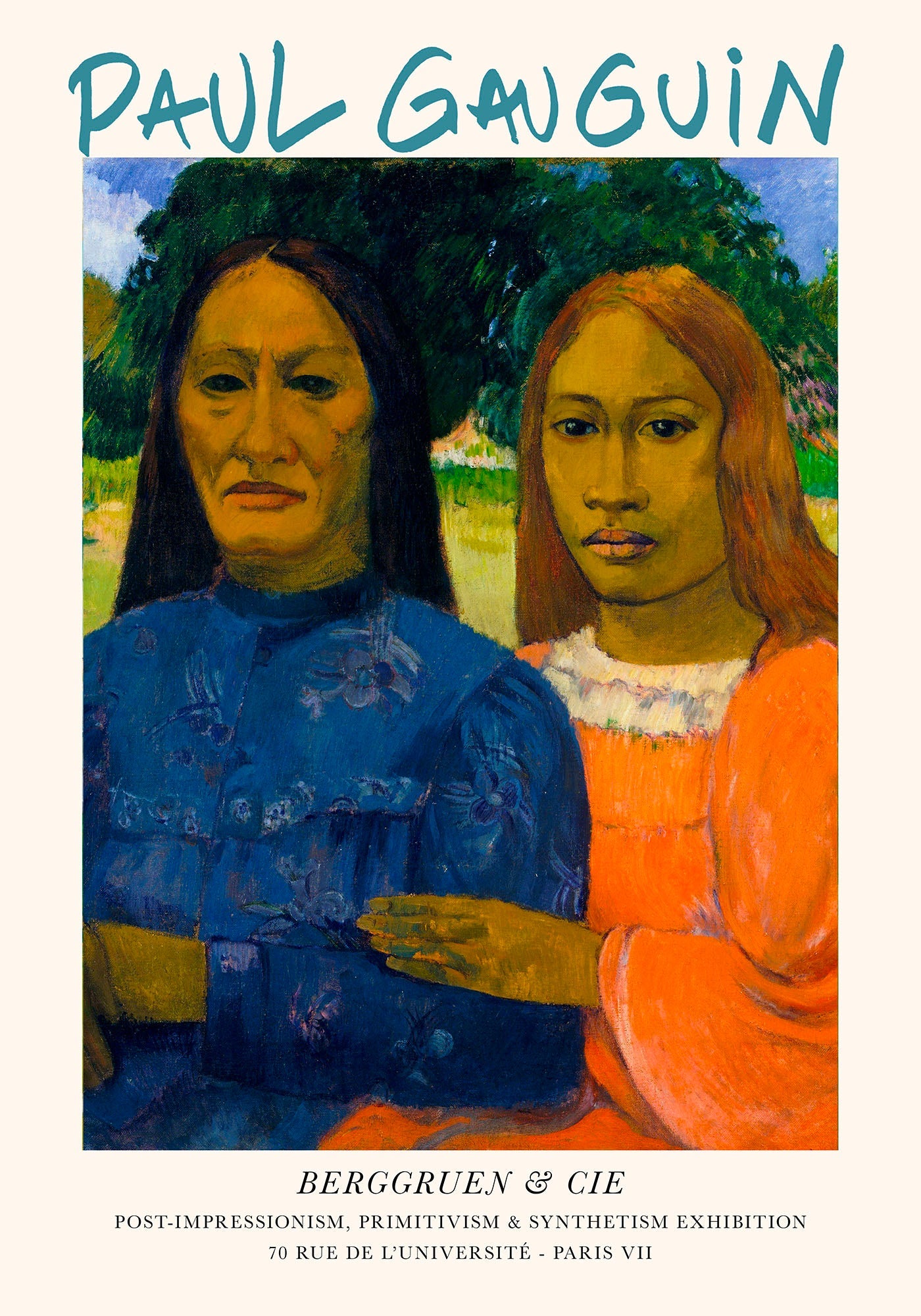 Das Two Women 1902 by Paul Gauguin Exhibition Poster zeigt ein ikonisches Werk des französischen Malers aus seiner späten Schaffensphase – farbstark, kontemplativ und voller Symbolik.