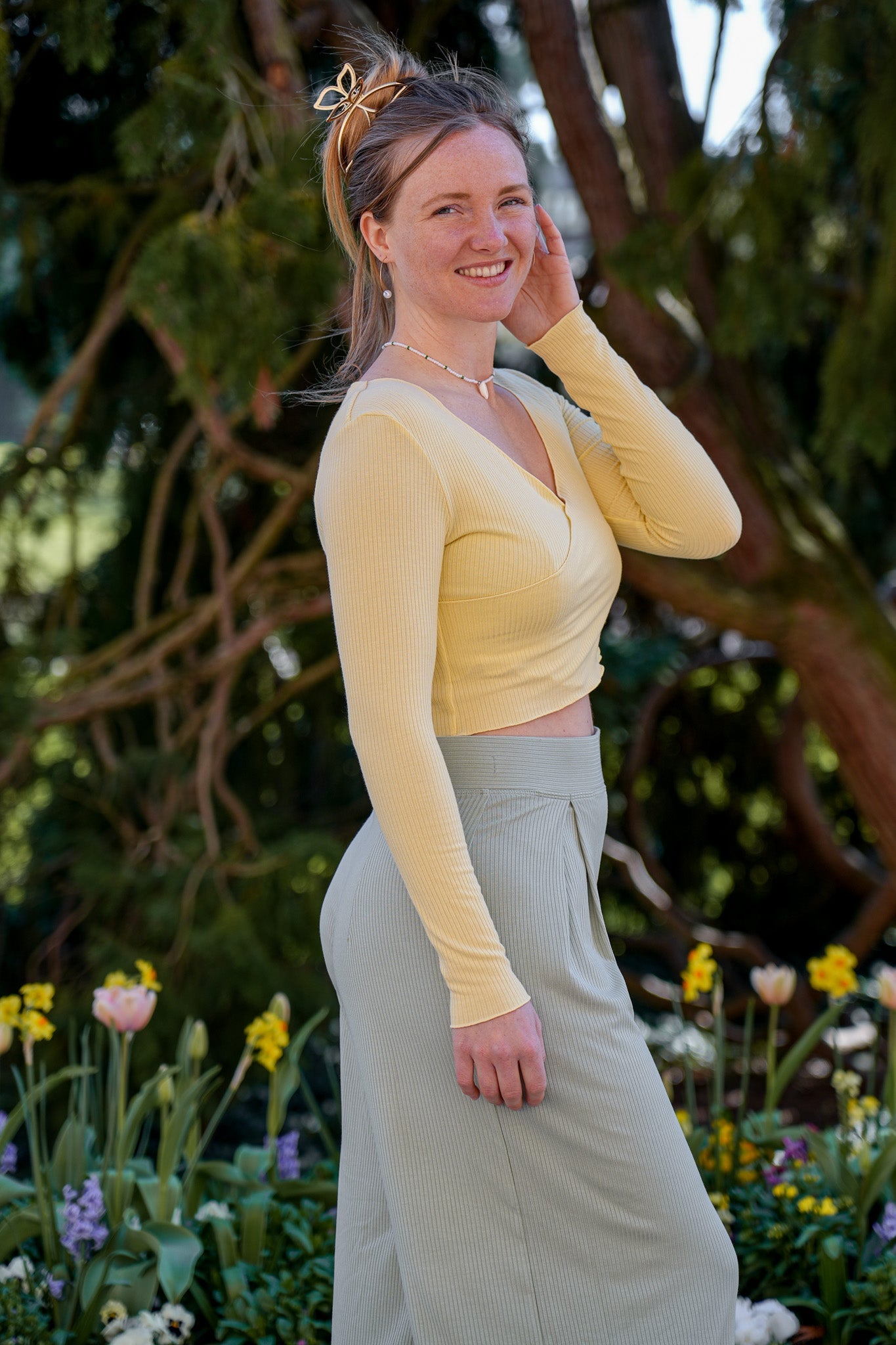 Rüschen an Ärmeln, V-Ausschnitt und Saum verleihen dem Pulli eine liebliche Note, während der überkreuzte Schnitt die Silhouette sanft betont. Das pastellige Gelb erinnert an sanfte Sonnenstrahlen und unterstreicht natürliche Frische und Lebensfreude – dezent, elegant und einfach kombinierbar.