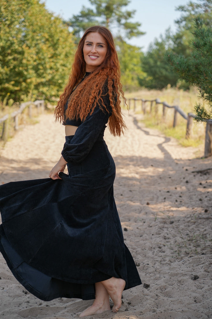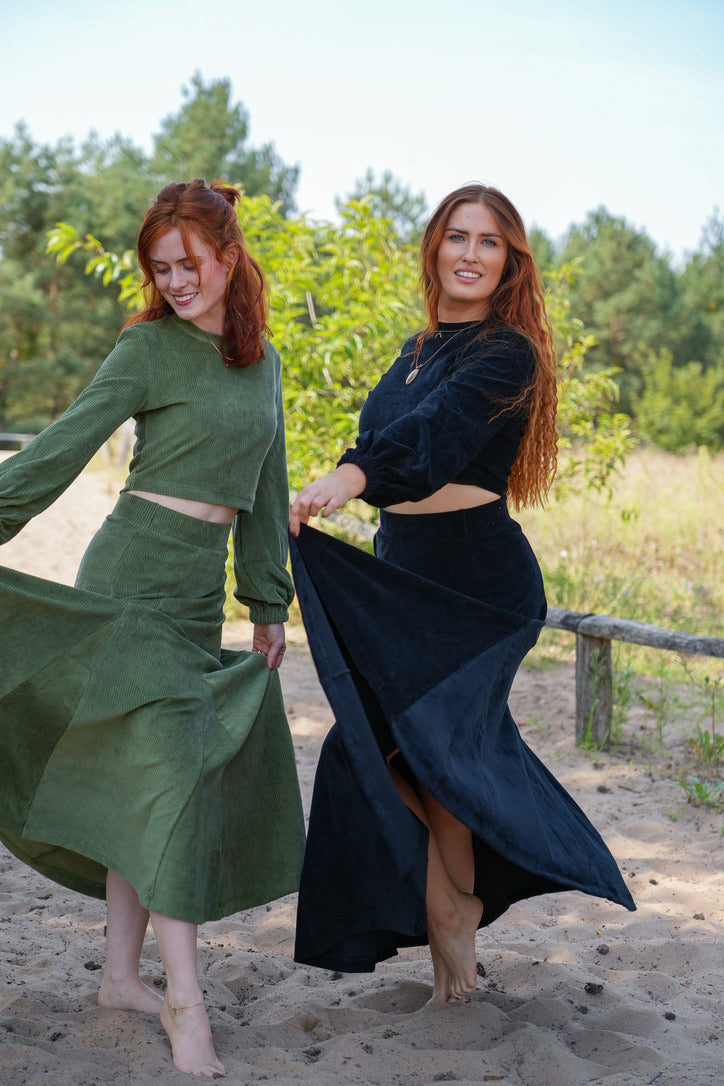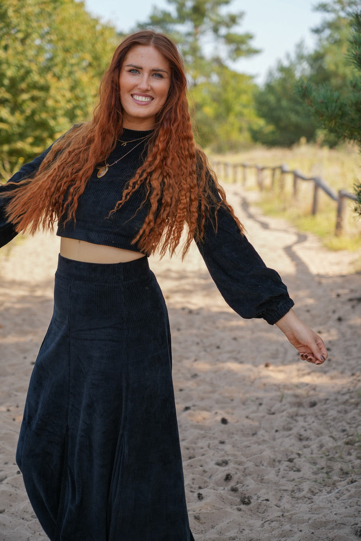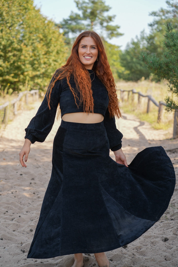 The Marleen skirt in black is a timeless must-have that adds elegance to any wardrobe. With its comfortable elastic waistband and integrated godets, it offers comfort and graceful width. The skirt combines sustainable corduroy fabric with a stylish design.