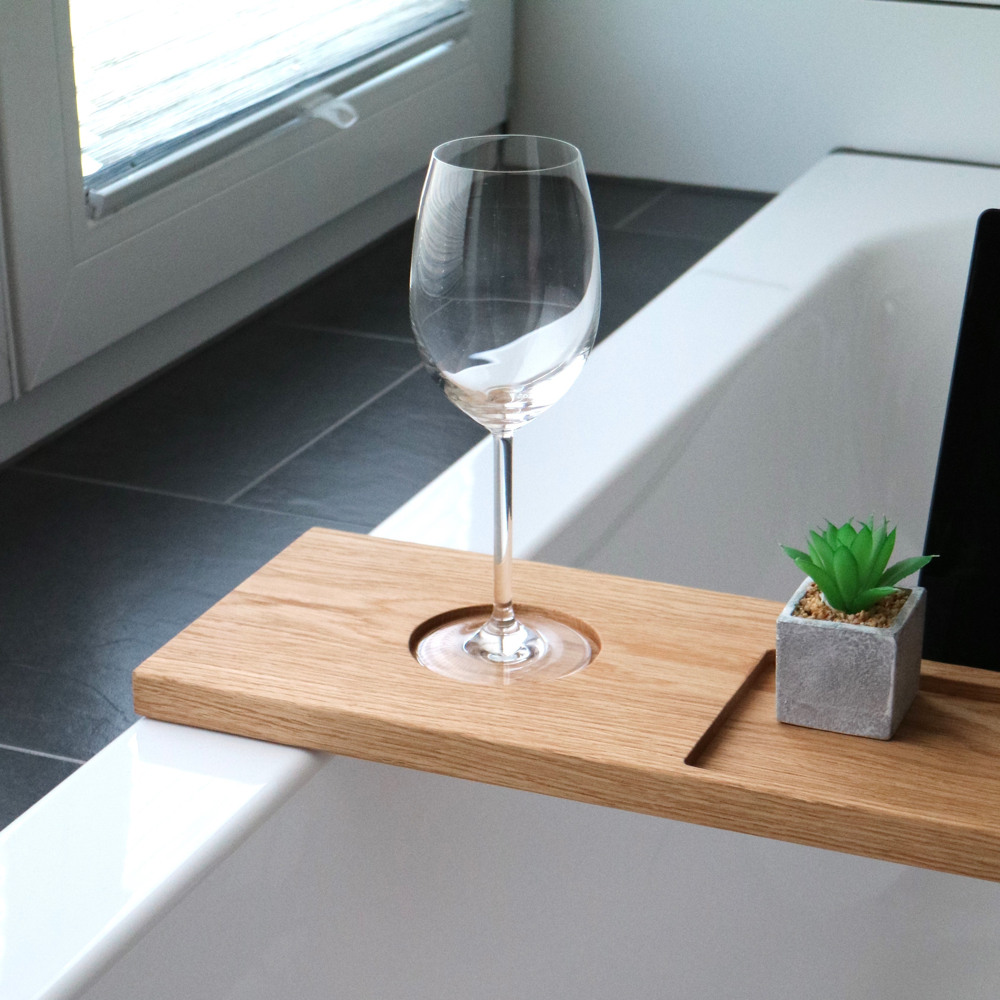 The LEA wooden bathtub caddy adds a luxurious touch to your bathing experience. Crafted from solid oak, it combines elegance and functionality. This accessory is ideal for enhancing your time in the bathroom.