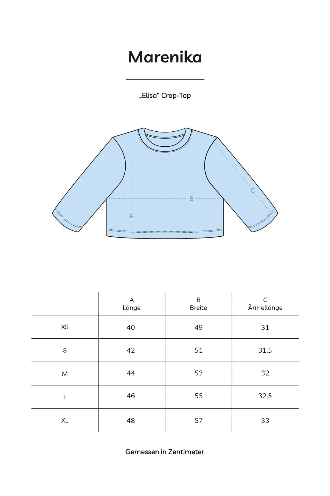 The ELISA crop top is made from 100% GOTS-certified organic cotton —a material that stands for sustainability, skin-friendliness, and comfort. The thicker cotton fabric offers complete opacity and shape retention, while the fine craftsmanship ensures longevity. The material remains soft and color-rich even after multiple washes, making it ideal for everyday wear.