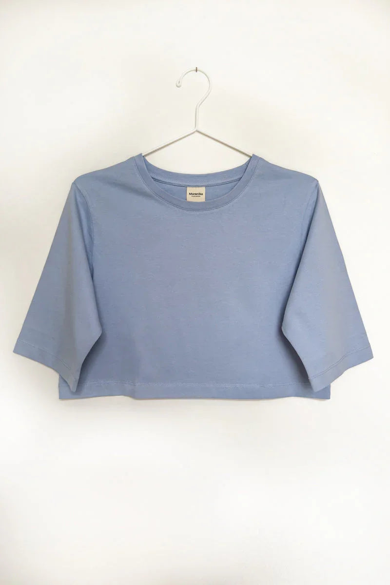 Sustainably crafted from GOTS-certified organic cotton, the ELISA crop top in light blue combines softness, opacity, and summery elegance into a versatile favorite.