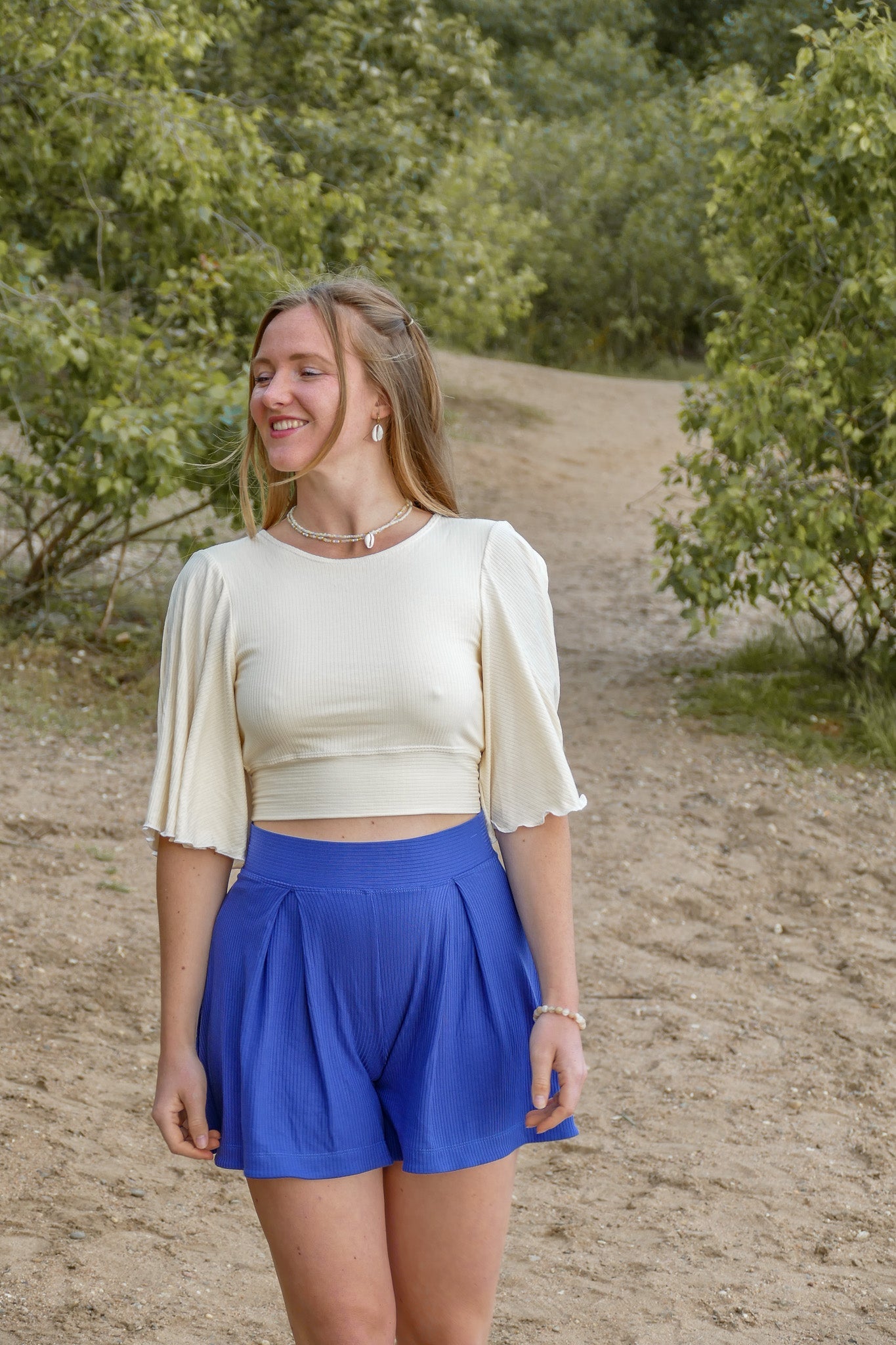 Der hohe, elastische Bund liegt weich an der Taille und betont deine Figur, während Falten im Vorderteil und Abnäher im Rückteil die Passform perfekt abrunden. Der tiefblaue Farbton erinnert an die Ruhe des Ozeans und macht diese Shorts zu einem vielseitigen, eleganten Allrounder für Alltag, Urlaub oder stilvolle Freizeitmomente.