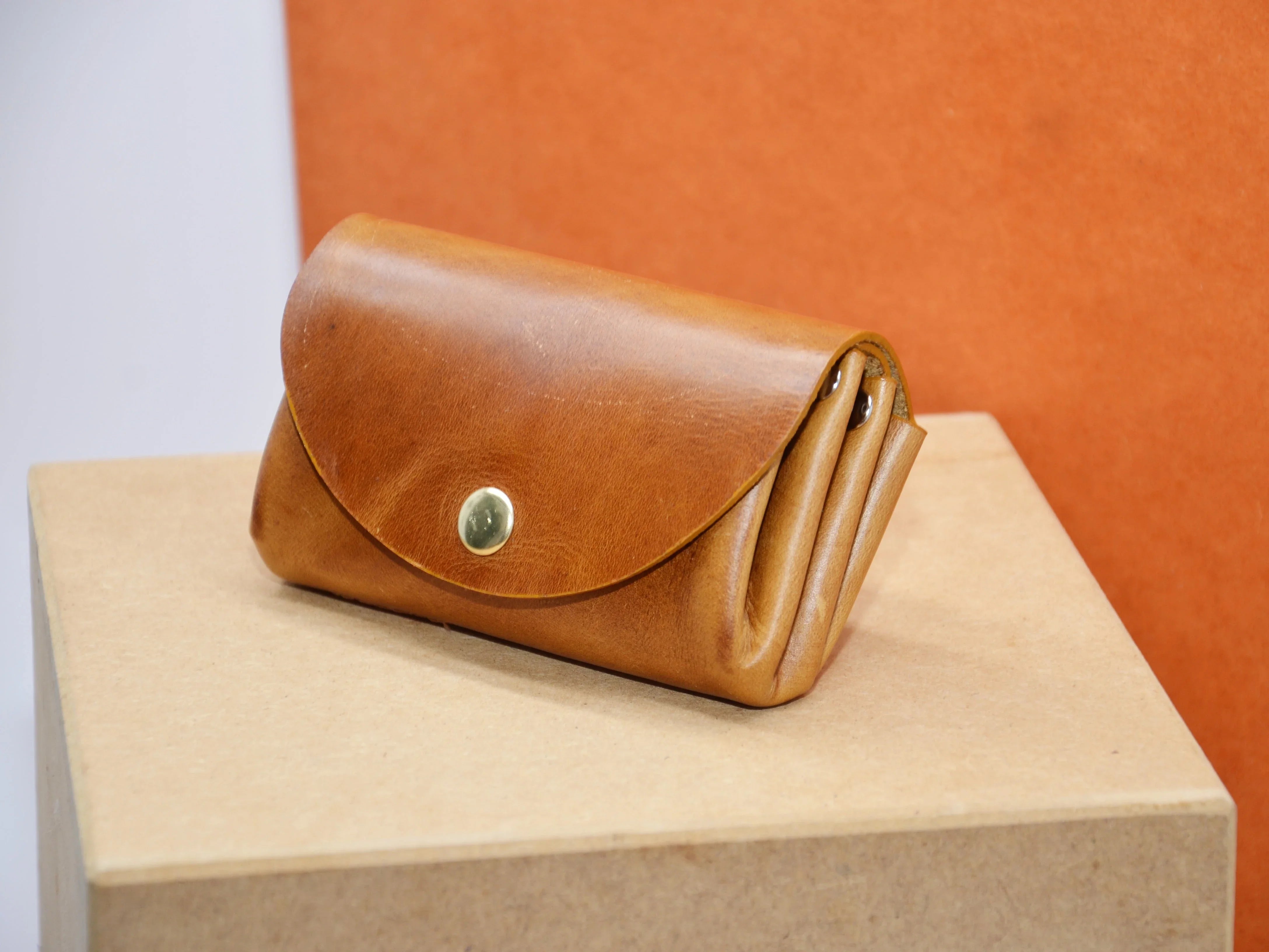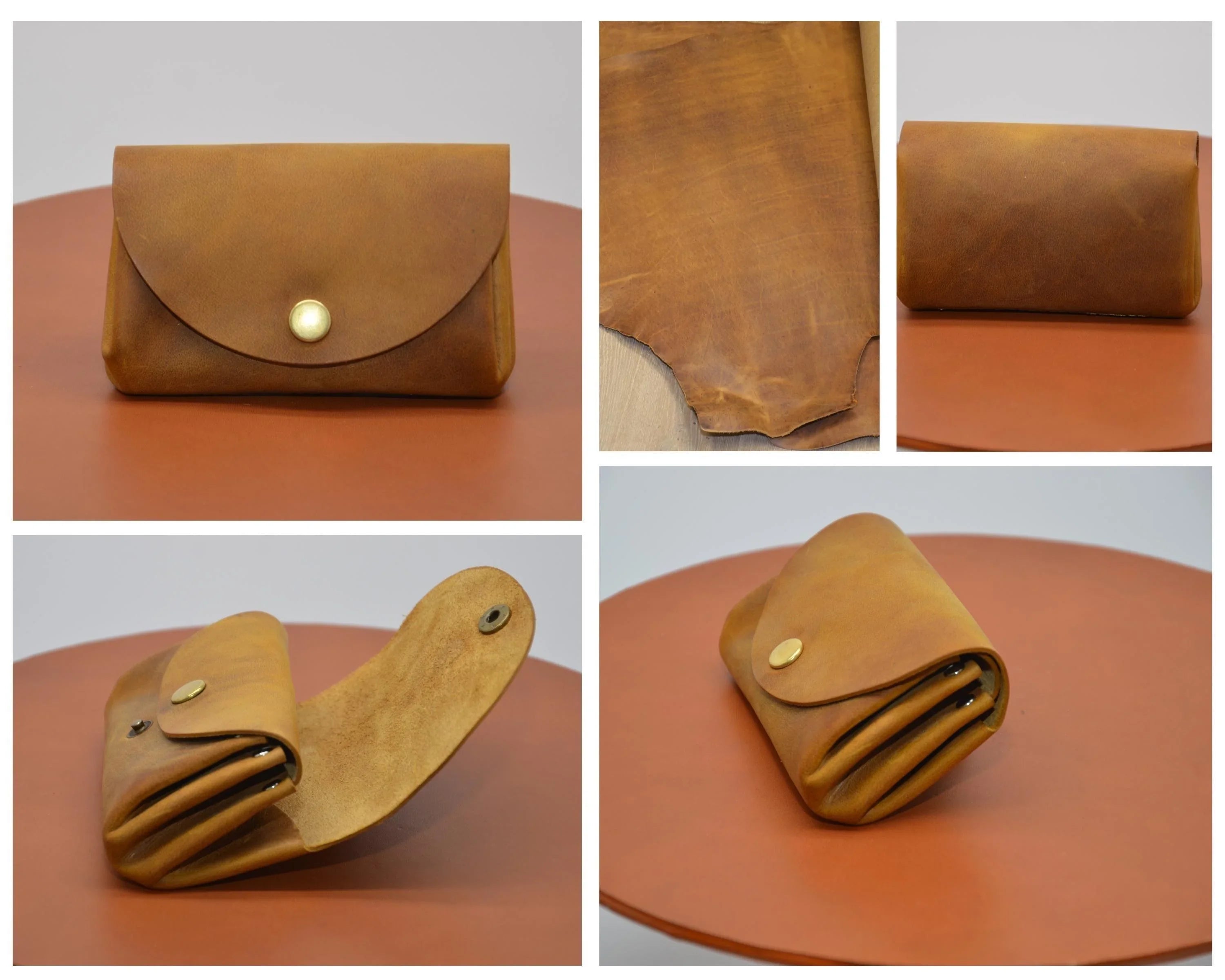 Maße: ca. 11,5 × 8 × 3,5 cm. Drei offene Fächer: vorderes Fach für Belege oder Tickets, mittleres Münzfach, hinteres Fach für Karten und Geldscheine. Robust verschlossen mit einem Druckknopf. Jedes Exemplar variiert leicht im Farbton und in der Maserung durch die natürliche Lederhaut.