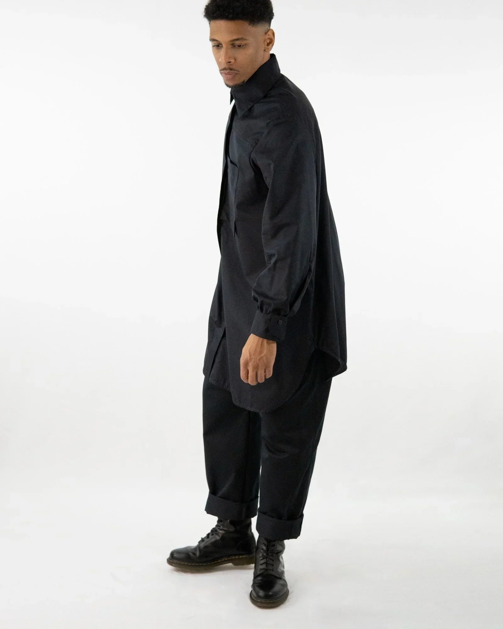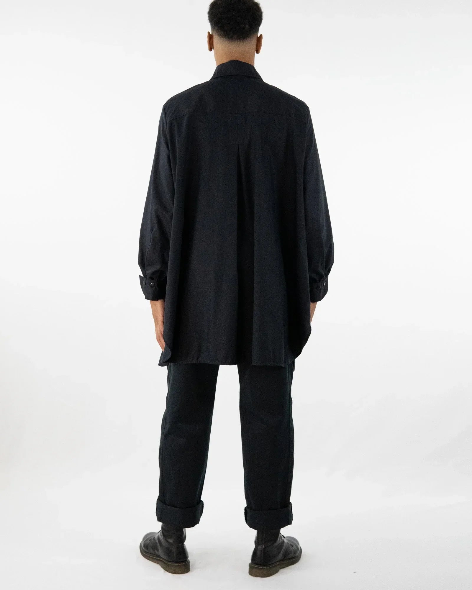 The NOBUO Dark Shirt represents conscious fashion without gender boundaries . The streamlined, oversized silhouette is complemented by a striking collar and subtle details like the integrated breast pocket in the concealed button placket .