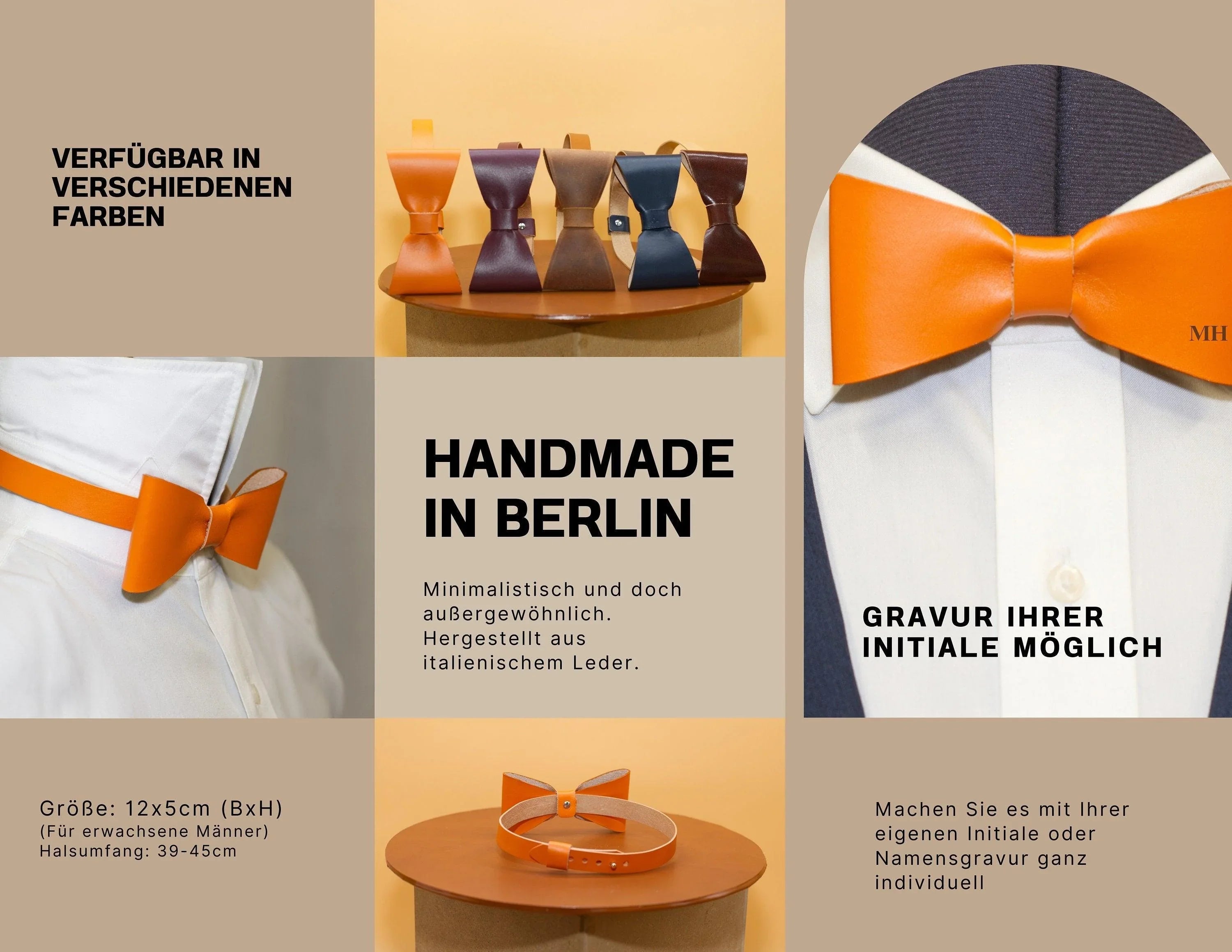 Die Minimalistische Lederfliege vereint klassische Form mit modernem Charakter. In liebevoller Handarbeit in Berlin gefertigt, wird jedes Stück zu einem edlen Einzelstück aus italienischem Leder – ein Highlight für Hochzeiten, Feiern und besondere Anlässe.