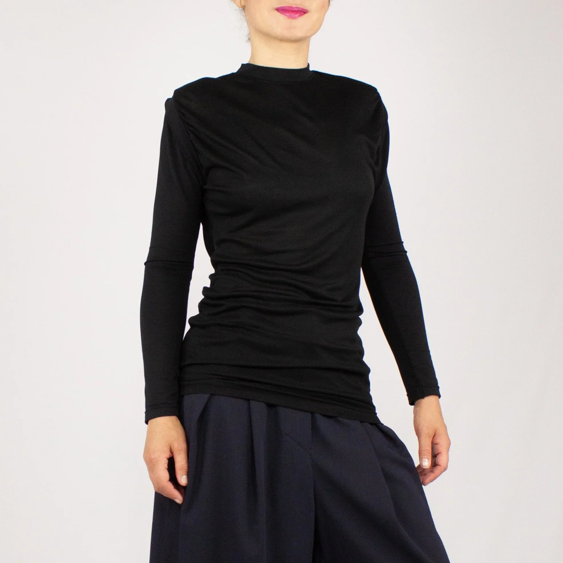 The short stand-up collar provides clear structure, while subtle gathers at the front and a soft waterfall effect at the back create dynamism and flowing lines.