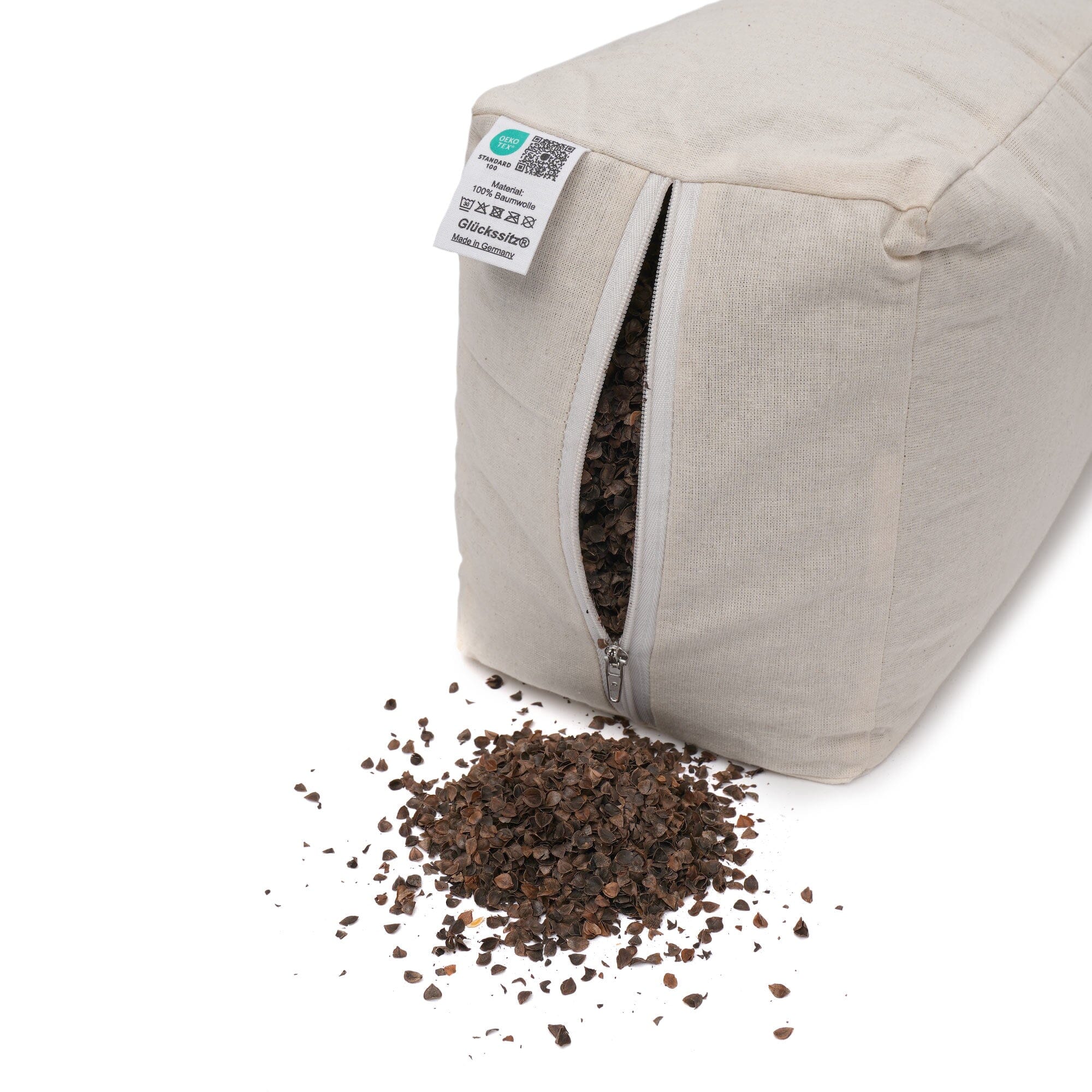 Die Verbindung aus reiner Baumwolle im Bezug und atmungsaktiver Buchweizenschalenfüllung sorgt für natürliche Nachhaltigkeit und Komfort. Der Stoff fühlt sich angenehm weich und robust an, der Reißverschluss ermöglicht einfaches Entnehmen oder Nachfüllen.