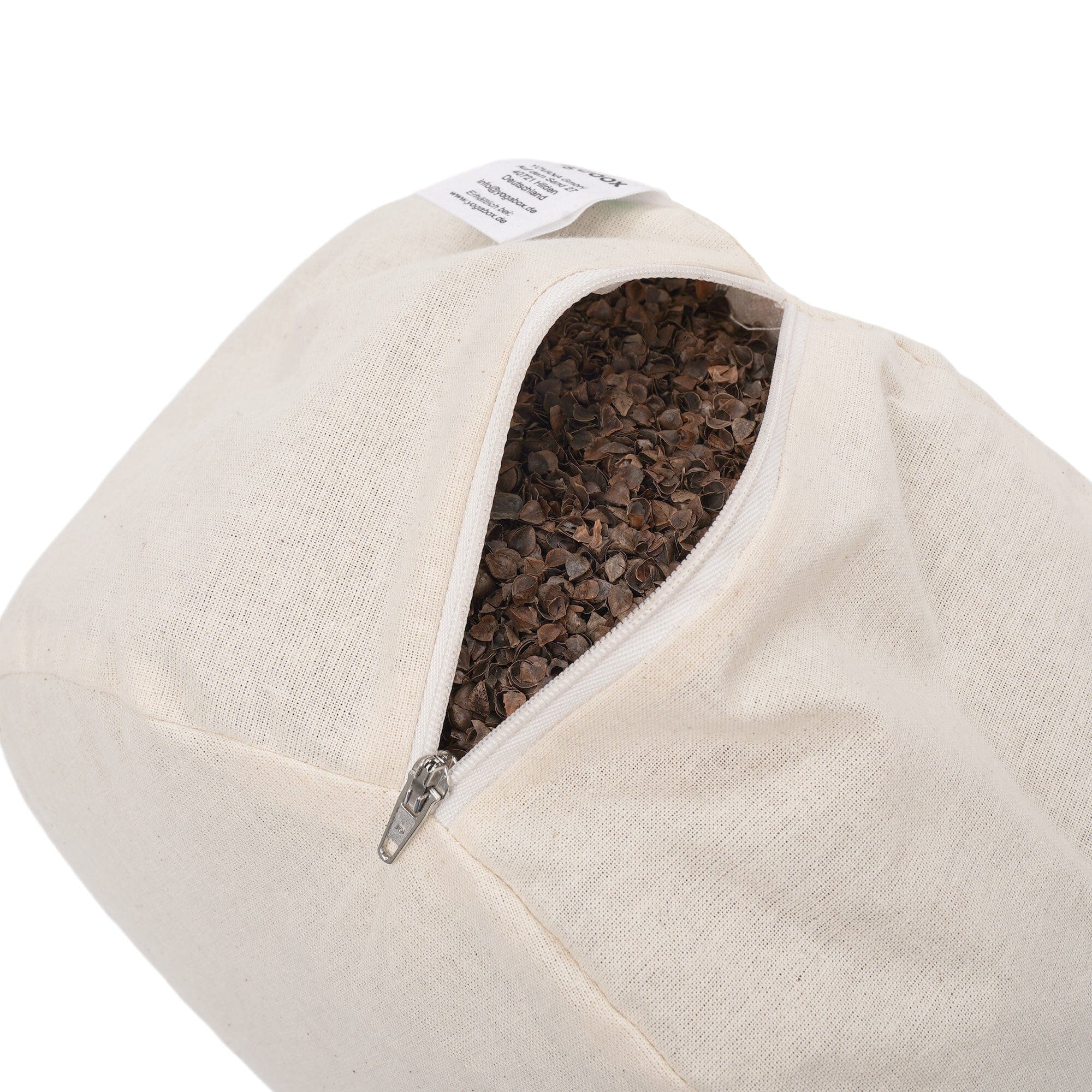 Bezug und Inlett bestehen aus reiner Baumwolle, die hautfreundlich und atmungsaktiv ist. Die Füllung aus Buchweizenschalen sorgt für ergonomische Anpassung und natürliche Stabilität. Der Bezug lässt sich unkompliziert abnehmen und bei bis zu 30 °C in der Maschine waschen.