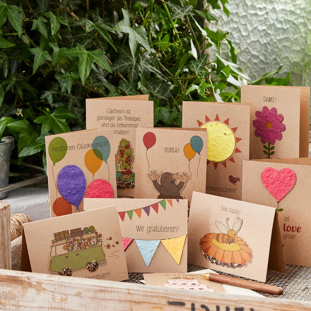 Das Set mit 10 wachsenden Grußkarten liefert für Geburtstag, Hochzeit, Danke & Co. die passende Karte – liebevoll gestaltet und mit integrierten Wildblumensamen für einen blühenden Nachklang.