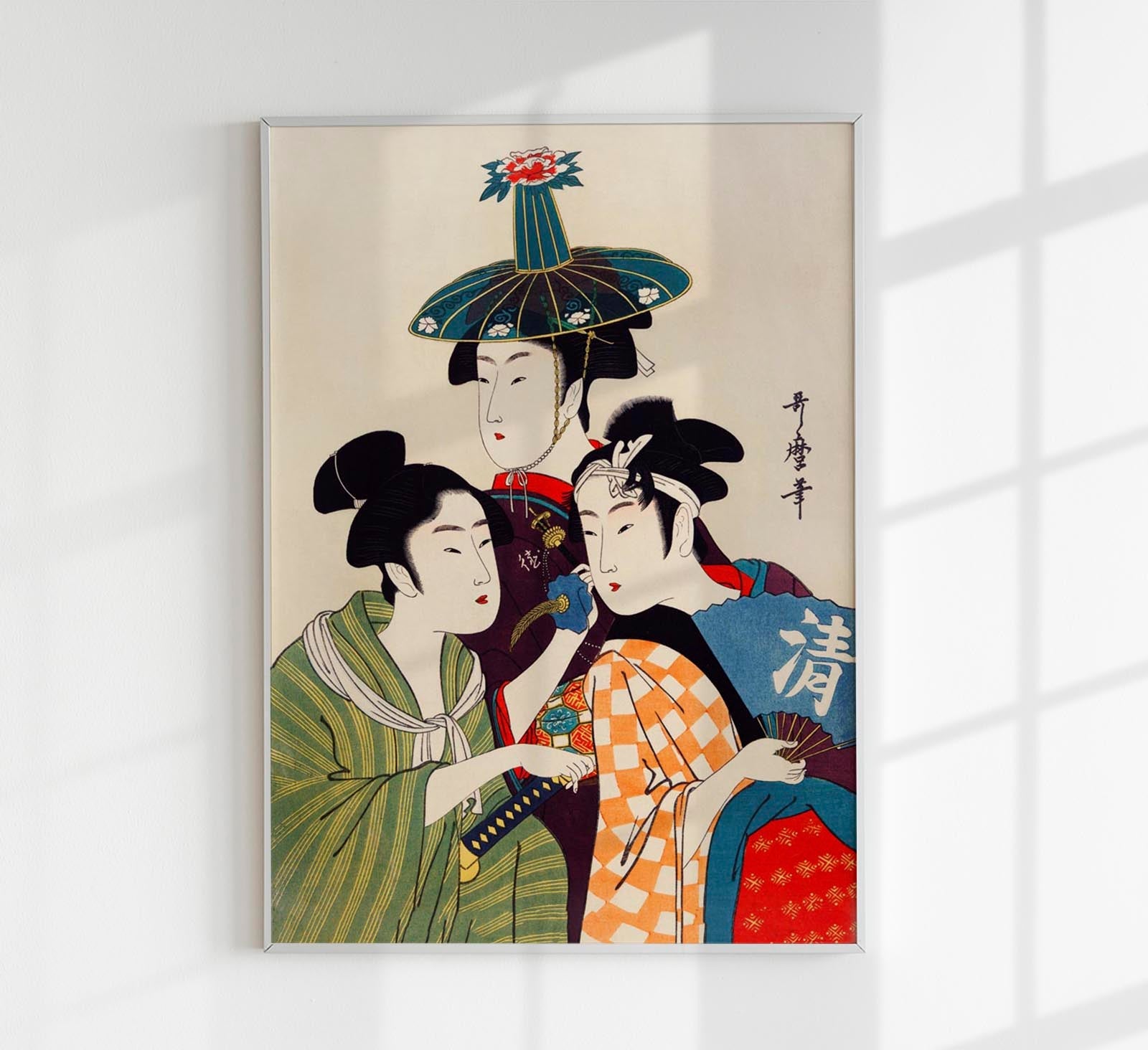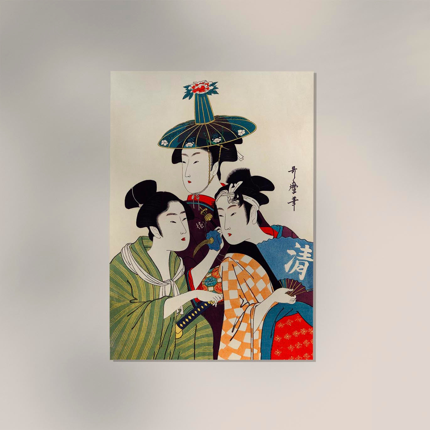 Das 3 Geishas and a Blue Hat Poster zeigt ein ikonisches Motiv nach Kitagawa und verbindet traditionelle japanische Ästhetik mit zeitloser Druckqualität. Der Fine Art Print inszeniert die anmutige Komposition dreier Geishas mit fein abgestimmten Farben und klaren Linien.