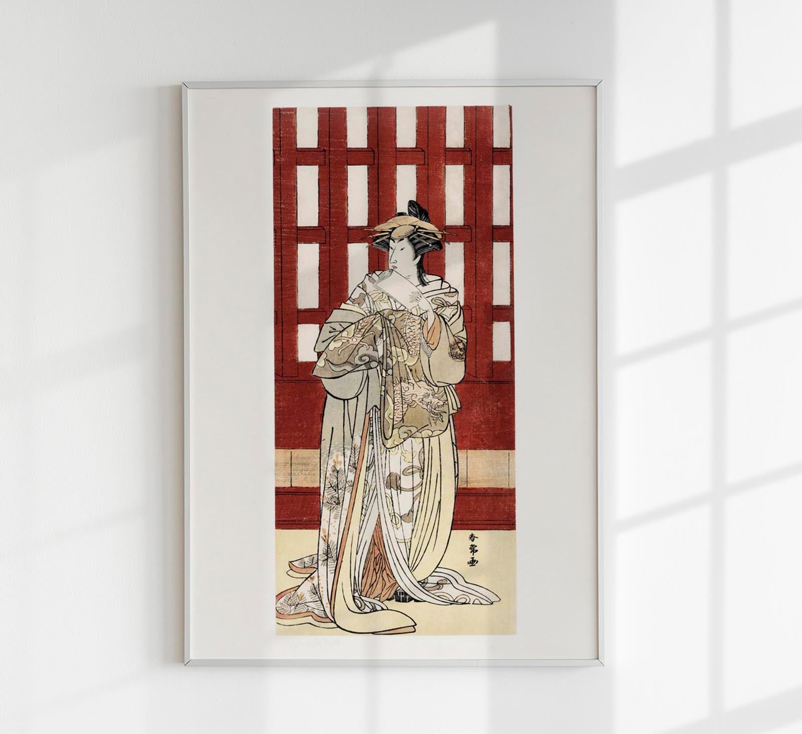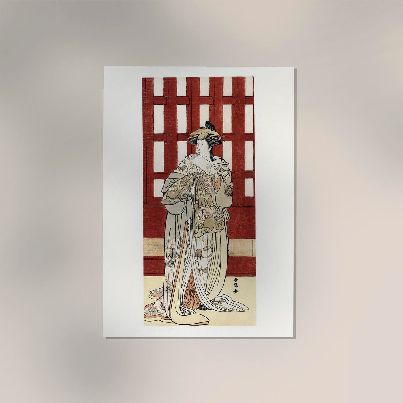 Das Actor in a Female Role Poster von Katsukawa Shunjo zeigt einen männlichen Kabuki-Schauspieler in der Rolle einer Frau (Onnagata), dargestellt im klassischen Ukiyo-e Holzschnittstil. Die detailreiche Darstellung und kräftigen Farben spiegeln die lebendige Theaterkultur der Edo-Zeit wider.