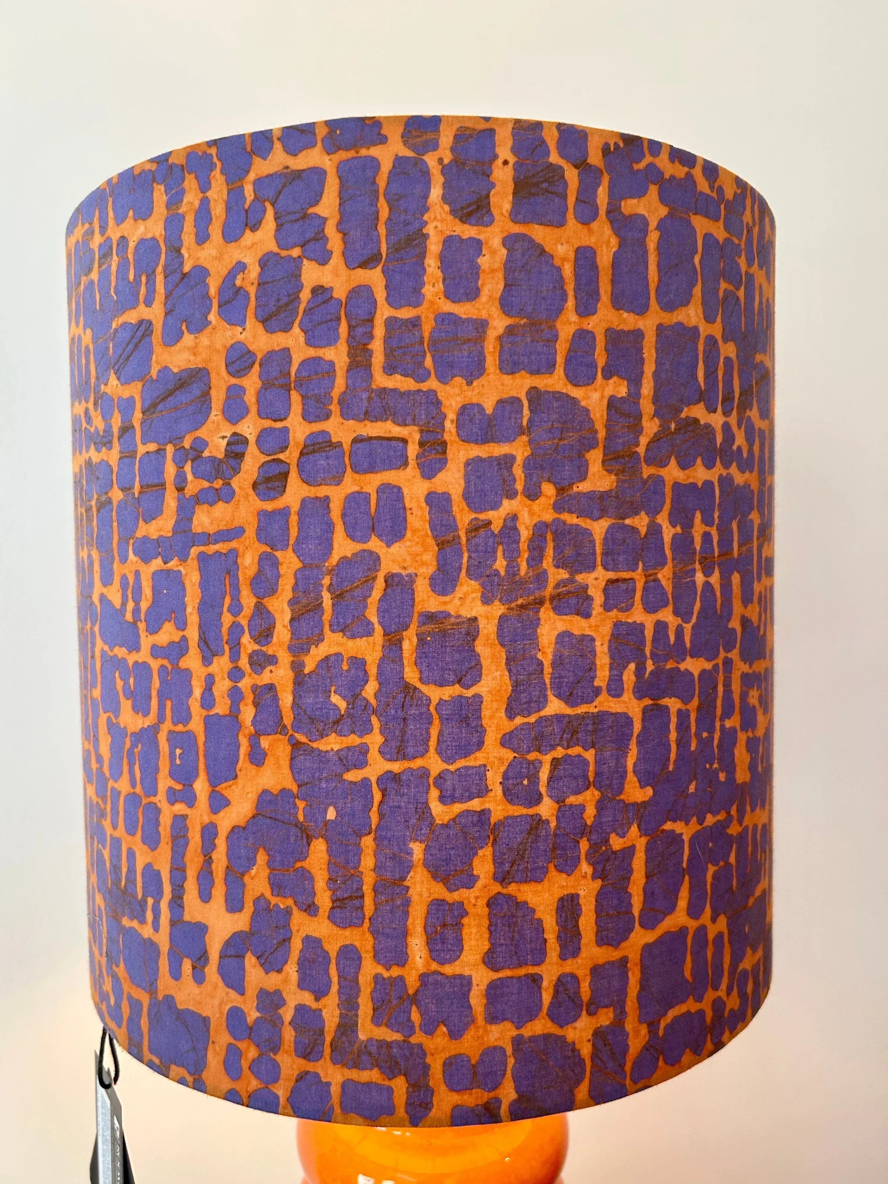 Fassung: Messingfarben, inklusive geprüftem Kabel mit Stecker und Wippschalter. Schirm: Homemade, Roomlight Studio Design aus lichtdurchlässigem afrikanischem Batikstoff in Orange/Lila, ø 25 x h 28 cm.
