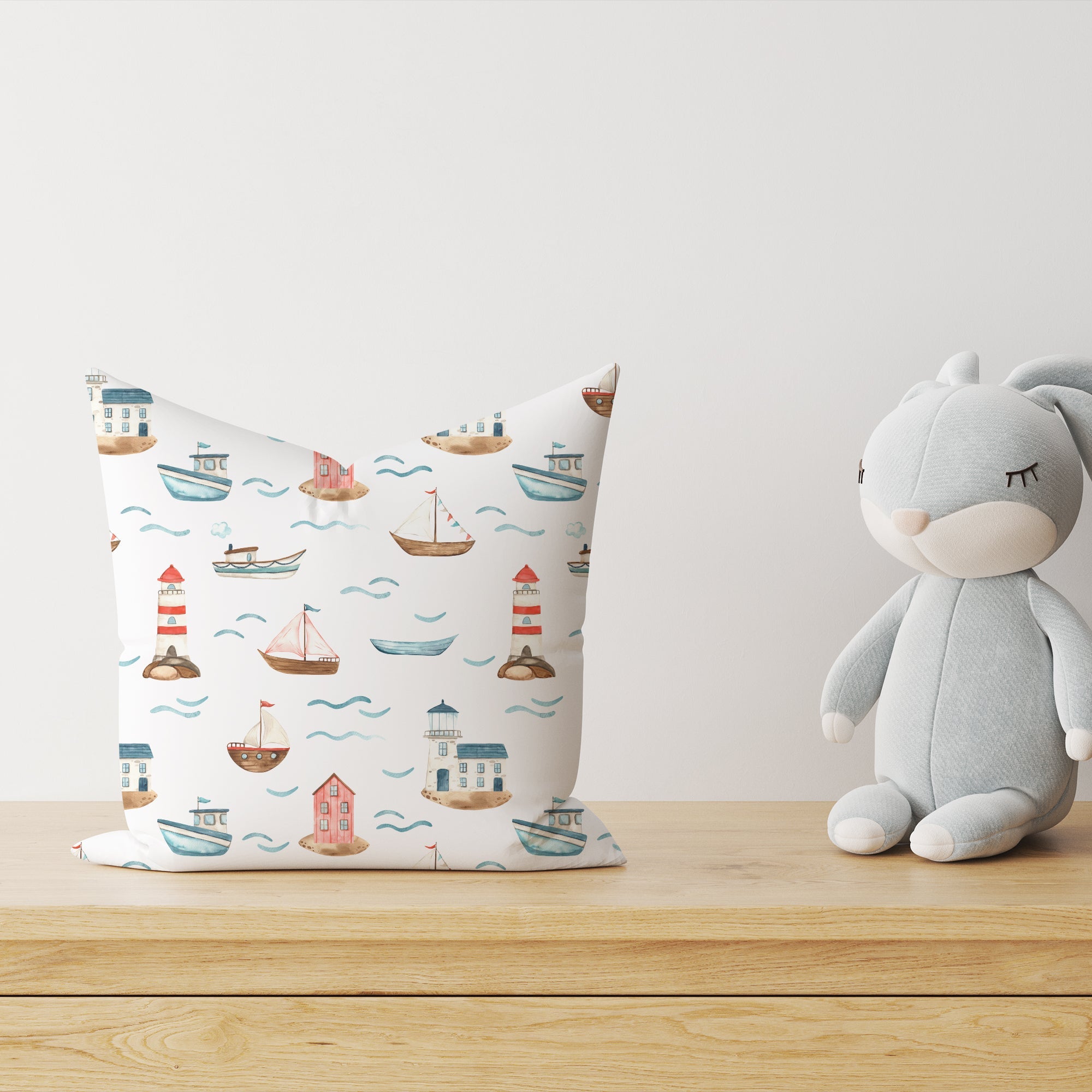 Das „Am Meer“ Premium Dekokissen bringt frische Küstenstimmung ins Zuhause: bunte Segelboote, Leuchttürme und kleine Inseln sorgen für geborgene Kuschelmomente wie bei einem Kurzurlaub am Meer.
