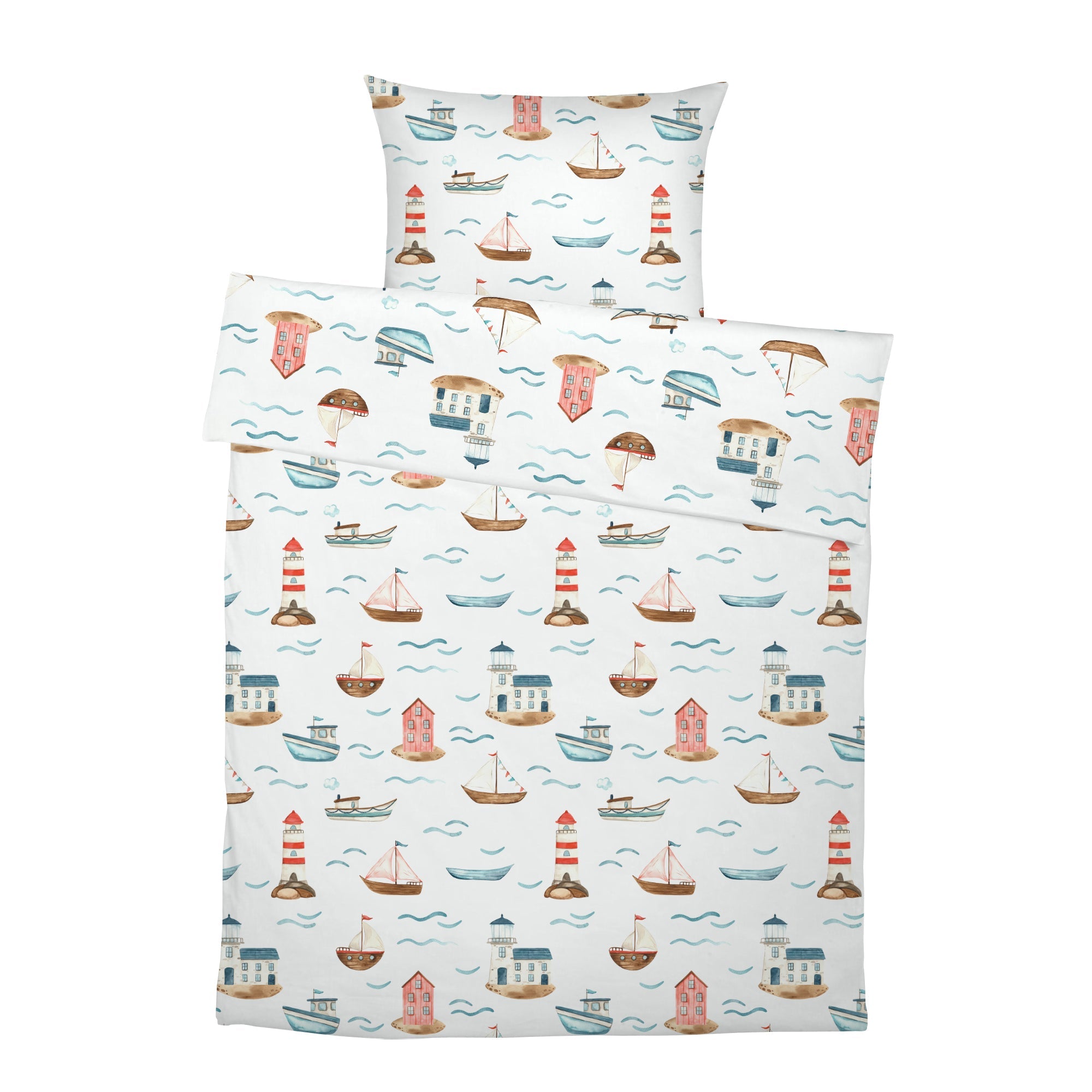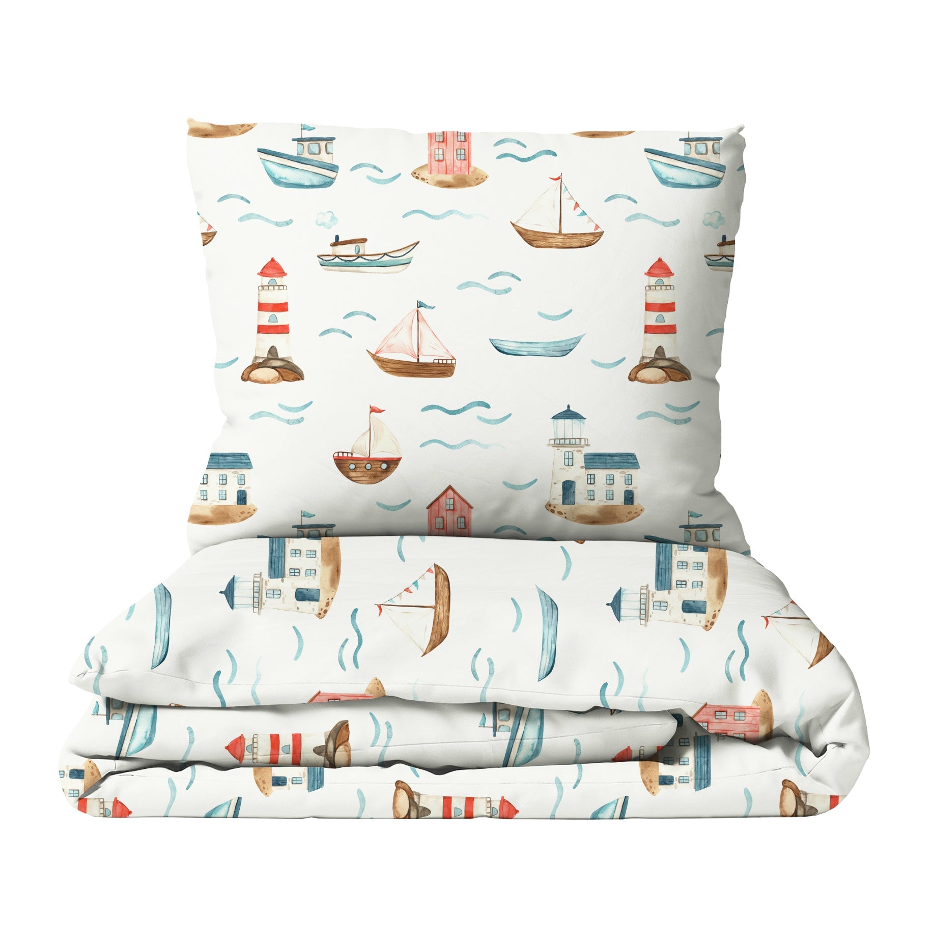 Das Leslis Kinderbettwäsche‑Set „Am Meer“ bringt maritimes Urlaubsfeeling mit Leuchttürmen, Segelbooten und kleinen Inselhäuschen – liebevoll handgemalt und detailreich für große Entdeckerträume.