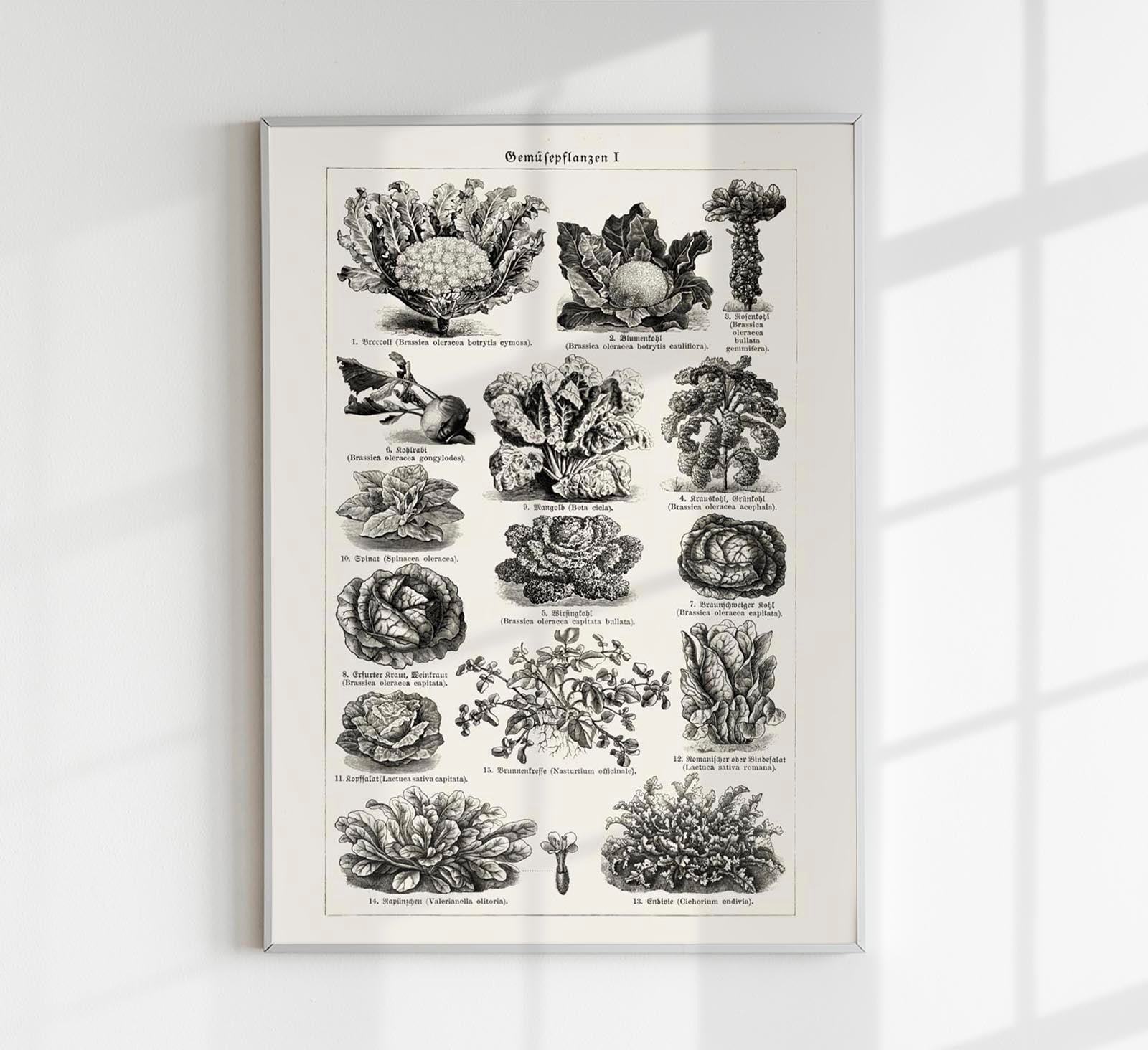 Ein hochwertiger Fine-Art Kunstdruck, der die Vielfalt von Gemüsesorten und traditionelle Druckkunst stilvoll kombiniert.