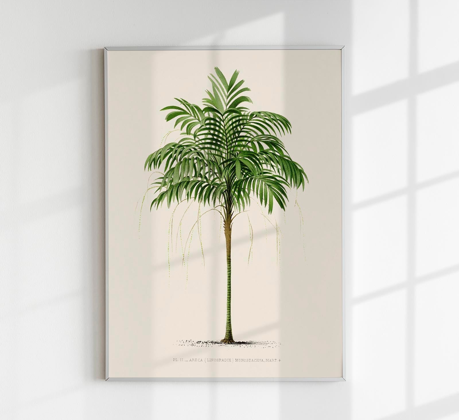 Das Areca Monostachya Poster zeigt eine detaillierte botanische Illustration dieser seltenen Kleinstpalme, die bevorzugt in subtropischen Regenwäldern an geschützten Standorten wächst. Der hochwertige Kunstdruck wird im Berliner Atelier auf Fine‑Art‑Papier oder Baumwollleinwand mit UV‑resistenten Tinten gefertigt.