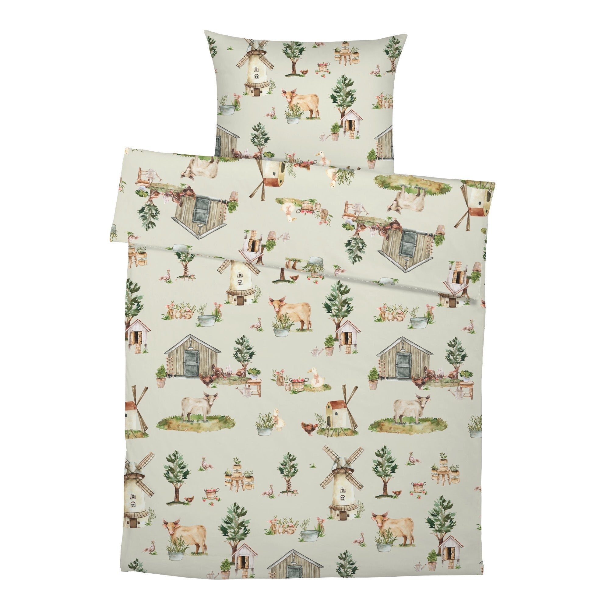 Die „Auf dem Bauernhof“ Premium Kinderbettwäsche von Leslis nimmt kleine Entdecker mit aufs Land: neugierige Kühe, flinke Hühner und fröhliche Traktoren sorgen für ländliche Träume und strahlende Augen.