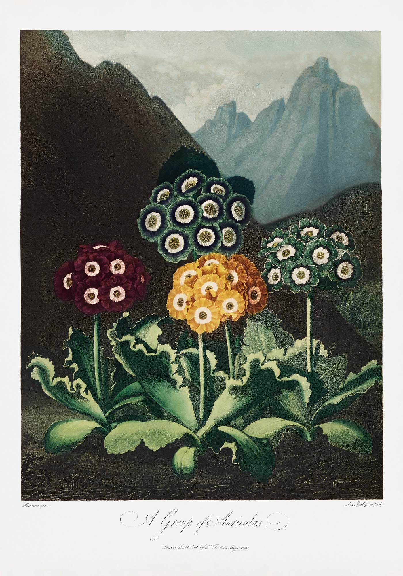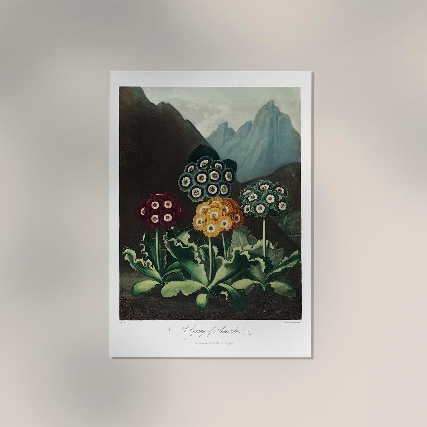 Das Auriculas from The Temple of Flora bringt natürliche Harmonie und künstlerische Tiefe in jedes Interieur – perfekt für Liebhaber botanischer Illustrationen und minimalistischer Ästhetik.