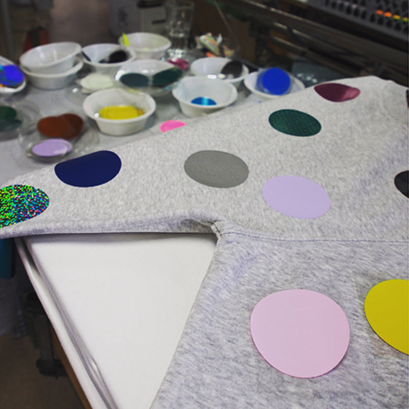 Die Kombination aus weichem, angenehm fallendem Shirtstoff und glänzenden, mehrfarbigen Punkte-Prints sorgt für hohen Tragekomfort und einen auffälligen, lichtreflektierenden Look. Oberflächen-/Tragegefühl: leicht, soft und bequem – mit glatter, glänzender Punkte-Struktur, die je nach Bewegung und Lichteinfall unterschiedlich schimmert.
