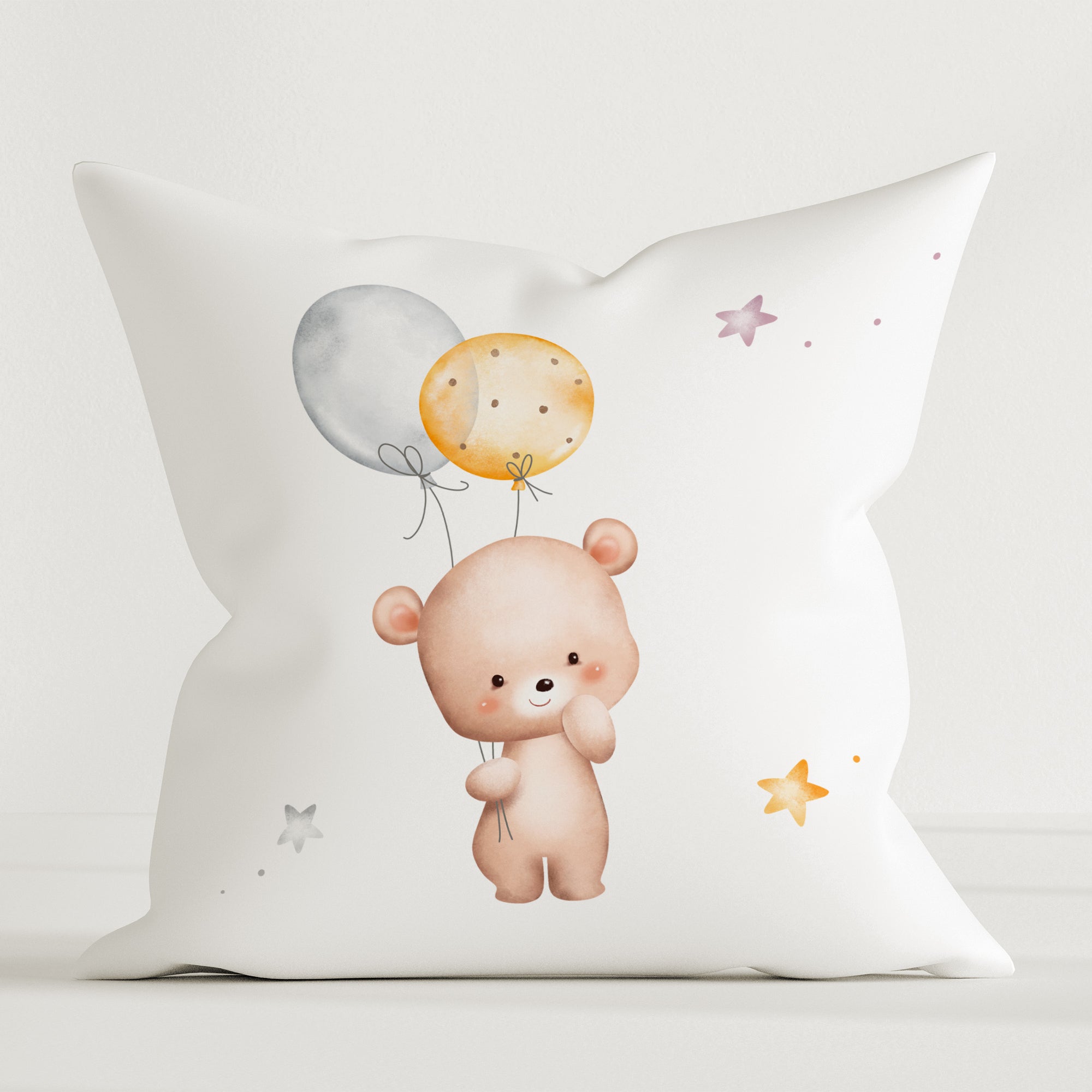 Das Bärchen Premium Dekokissen bringt mit niedlichen Bärchen und schwebenden Luftballons verspielte Leichtigkeit ins Kinderzimmer – farbenfroh, freundlich und zum Sofort‑Kuscheln gemacht.