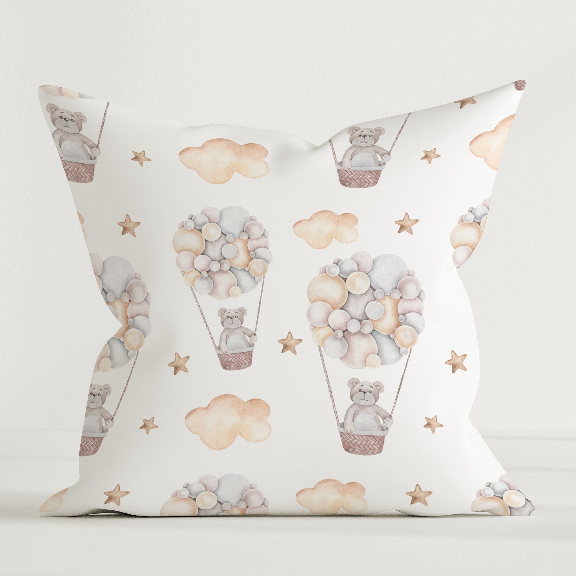 Das Bärlis Ballonfahrt Premium Kinder Dekokissen von Leslis schenkt dem Kinderzimmer eine luftig-leichte Atmosphäre: Ein kleiner Bär schwebt im Heißluftballon durch sanfte Pastellwolken – perfekt für kuschelige Tagträume und abendliche Geschichten.
