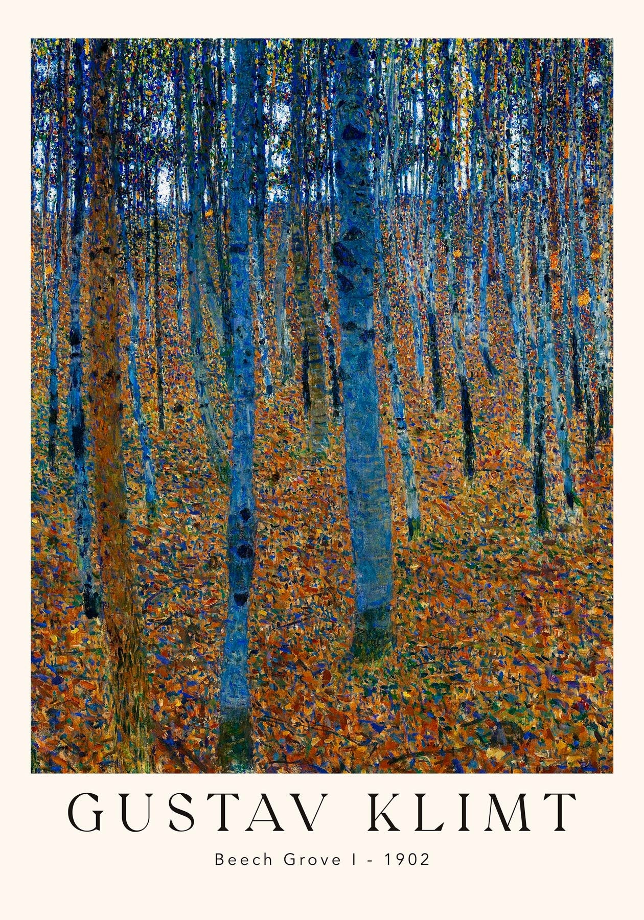 Das Beech Grove by Gustav Klimt Exhibition Poster fasst den ikonischen Buchenhain in eine kuratierte Plakat‑Ästhetik – schlanke Stämme, ein schimmernder Blätterteppich und ein schmaler Himmelsstreifen verdichten sich zu stiller, rhythmischer Waldarchitektur.