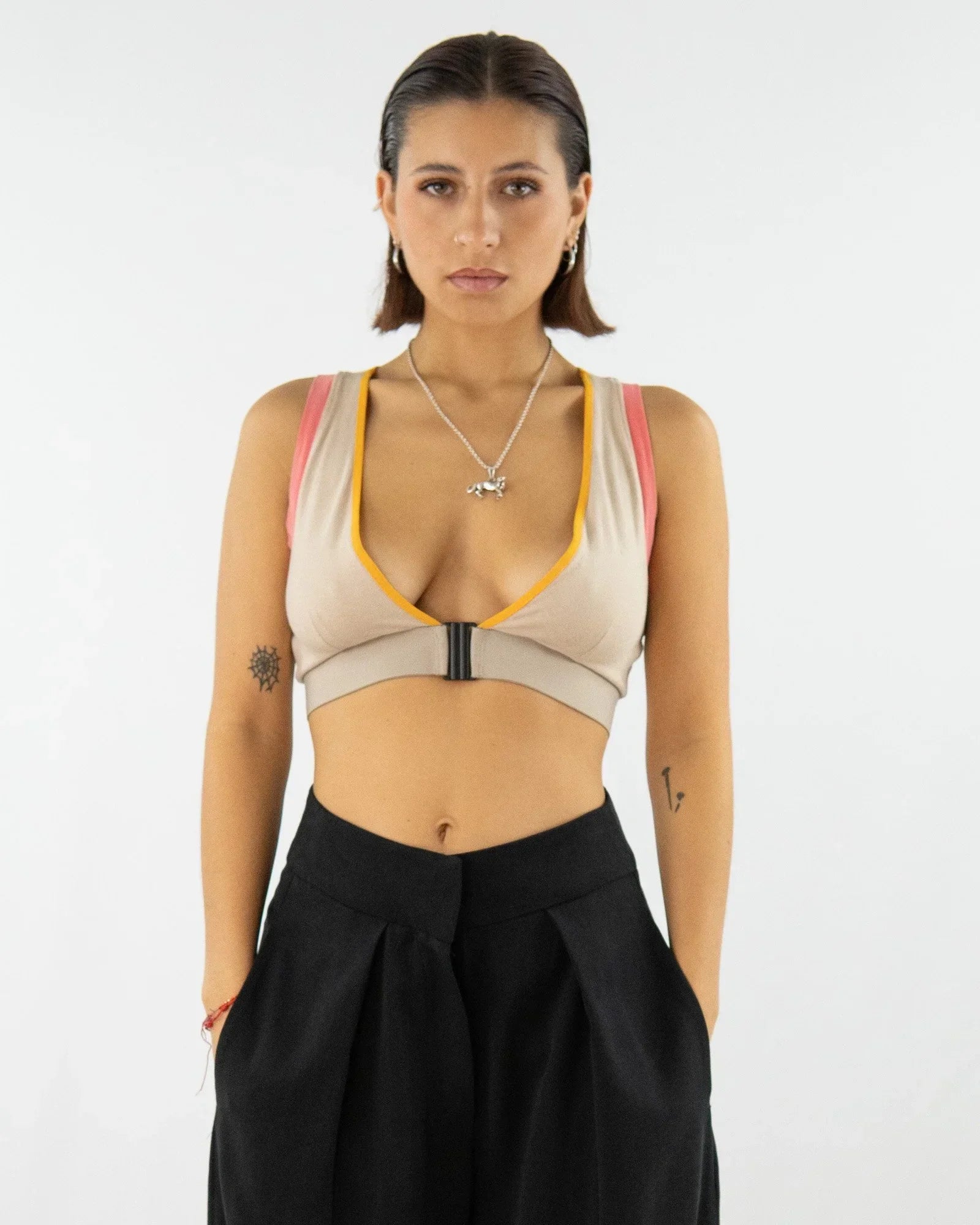 Verschlossen wird das Top vorne mit einem breiten Bikiniverschluss – funktional und zugleich ästhetisch. Das weiche, elastische Unterbrustgummi hält das Top sicher am Körper. Alle Armlöcher sind mit Bändern eingefasst – für Formstabilität und einen sauberen Look.