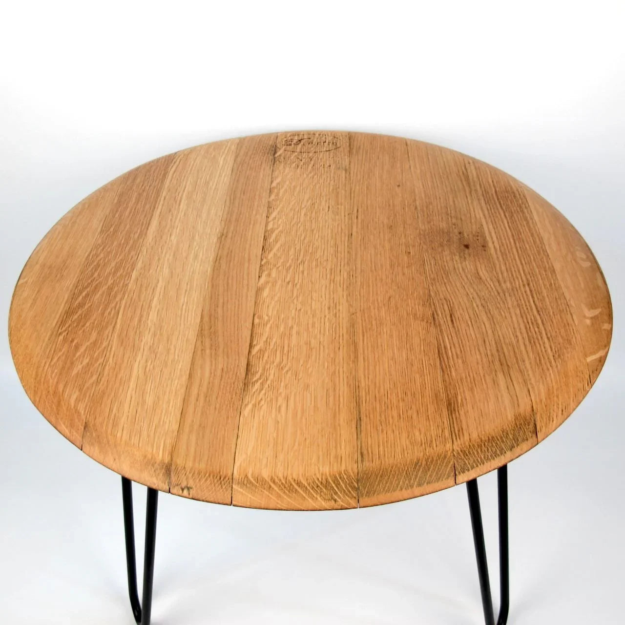 Jedes Stück ist ein Unikat: Der Tisch besteht aus einem ehemaligen Rotweinfass und trägt die Spuren seiner ursprünglichen Nutzung – ganz ohne Prägung, aber mit authentischem Charakter.