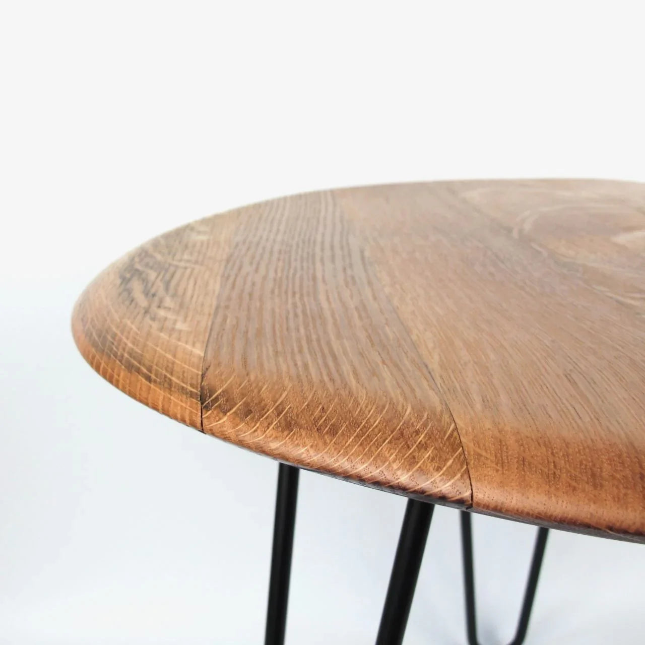 Dieser Tisch vereint einzigartige Geschichte und zeitloses Design. Gefertigt aus einem alten Rotweinfassdeckel, wird jedes Stück sorgfältig geölt, um Langlebigkeit und Pflegeleichtigkeit zu gewährleisten.