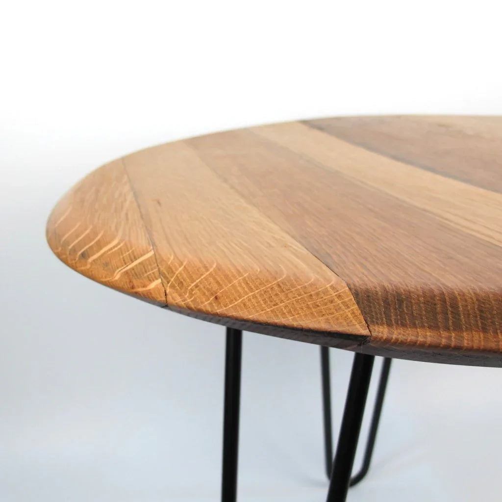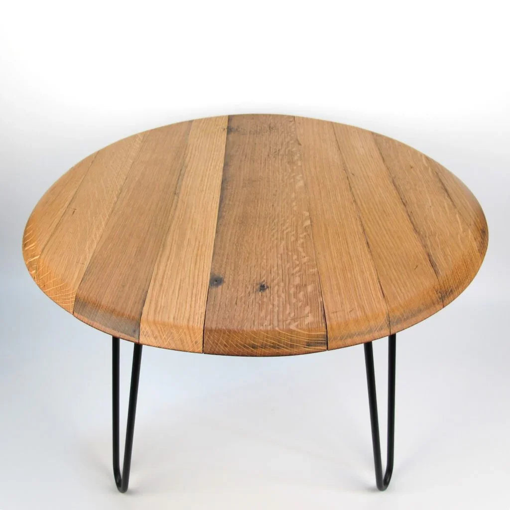Das recycelte Fassholz wird sorgfältig aufbereitet, geölt und an der Unterseite versiegelt, um Abfärbungen zu vermeiden. So entsteht ein langlebiges und nachhaltiges Möbelstück mit Geschichte.