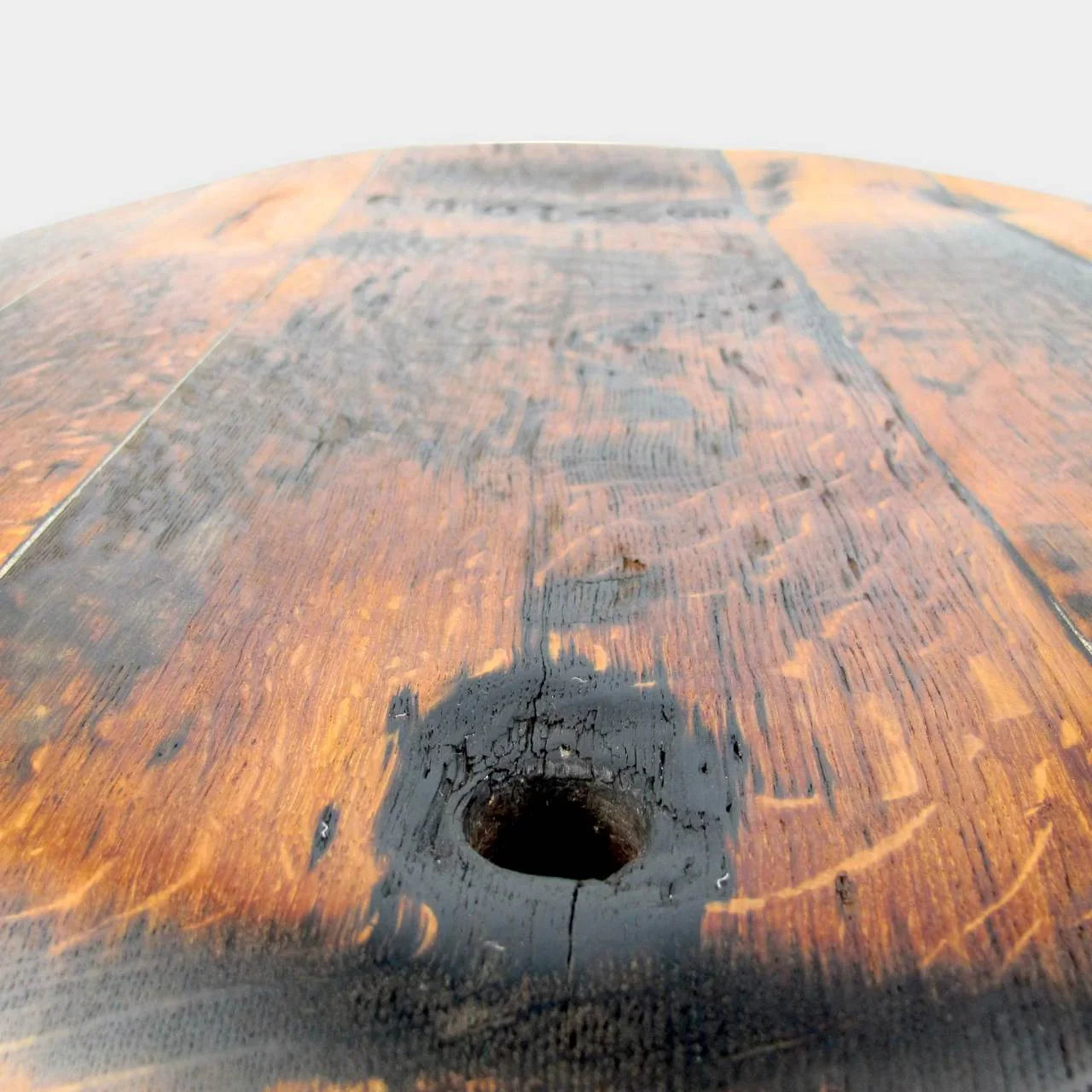 Original-Weinfassdeckel mit Prägung „680L“: Jeder Tisch trägt sichtbare Spuren der Weinlagerung – ein echtes Unikat mit Geschichte und Charakter.