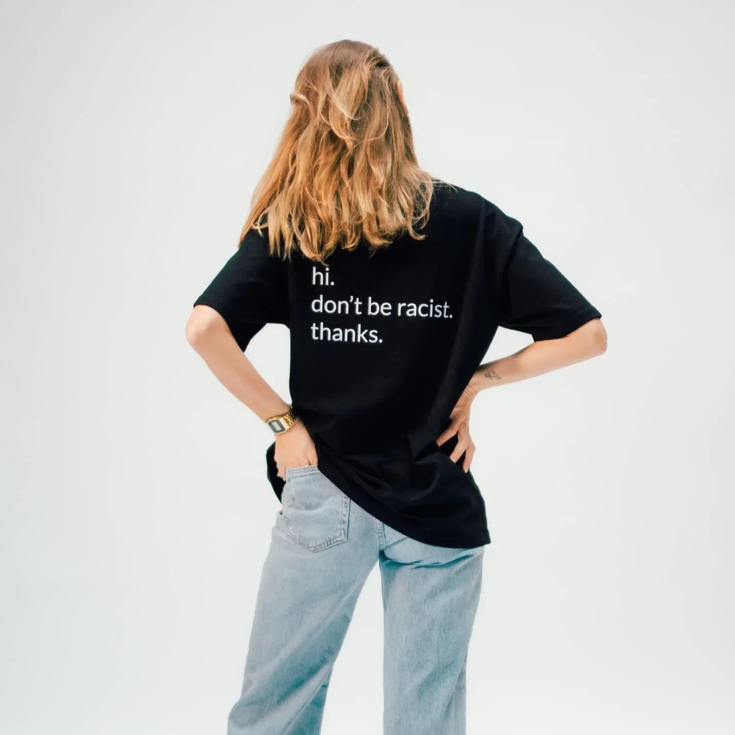 Dieses T-Shirt ist kein Modegag, sondern eine klare Haltung – gegen Rassismus und für Gleichberechtigung. Die schlichte Typo auf der Brust macht den Unterschied: ruhig, ehrlich, stark. Kombiniere es lässig mit Jeans oder trage es bewusst unter einer offenen Jacke – dieses Shirt spricht für sich.