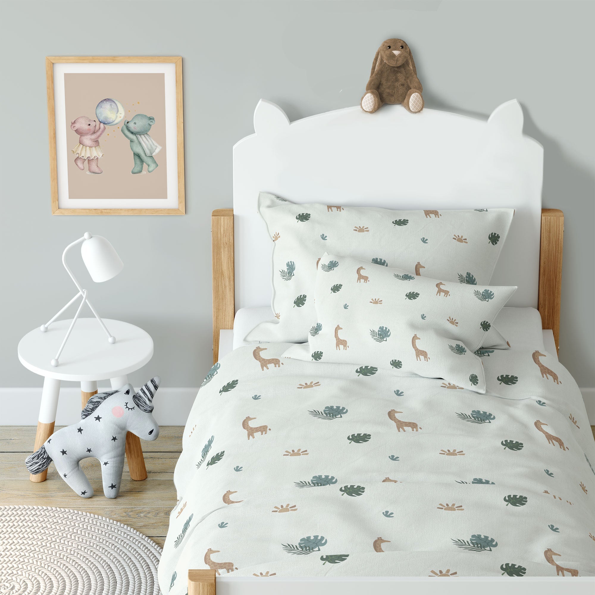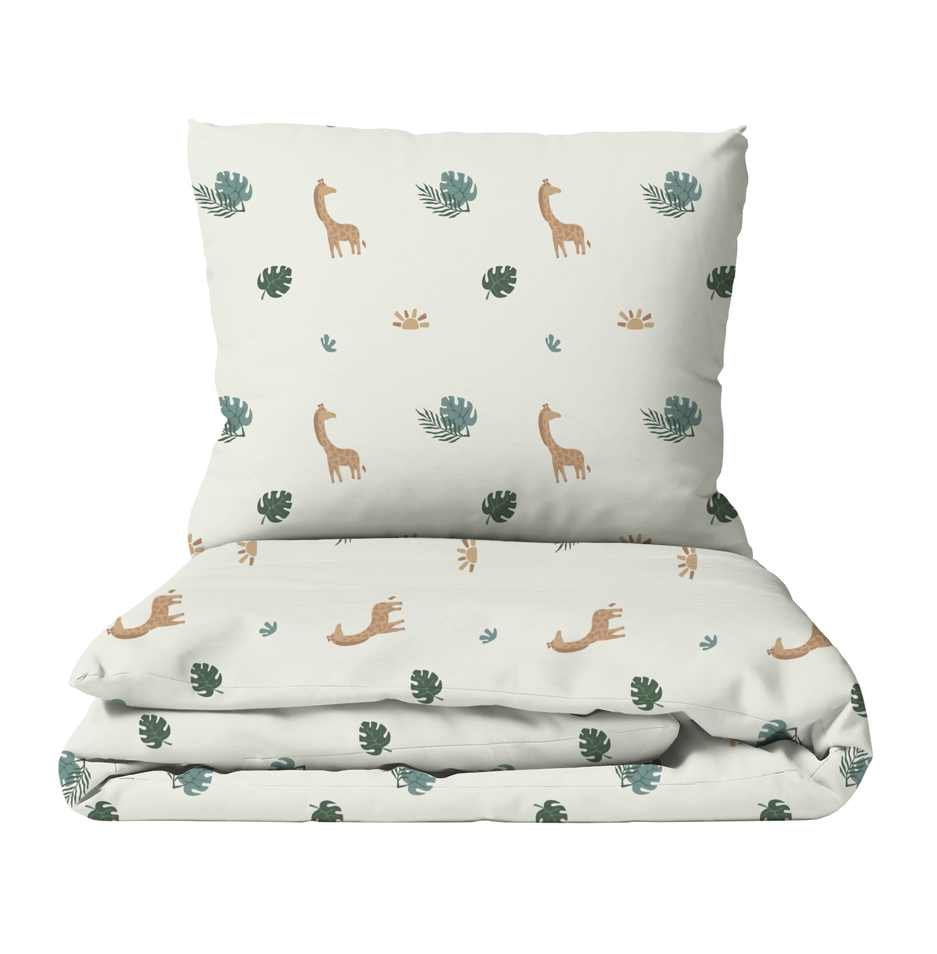Die Dschungel Kinderbettwäsche entführt kleine Abenteurer in eine tropische Traumwelt mit sanften Giraffen und üppigen Palmenblättern. Gefertigt aus OEKO-Tex 100 zertifizierter Baumwolle, bietet sie eine weiche, hypoallergene Schlafumgebung voller Geborgenheit.
