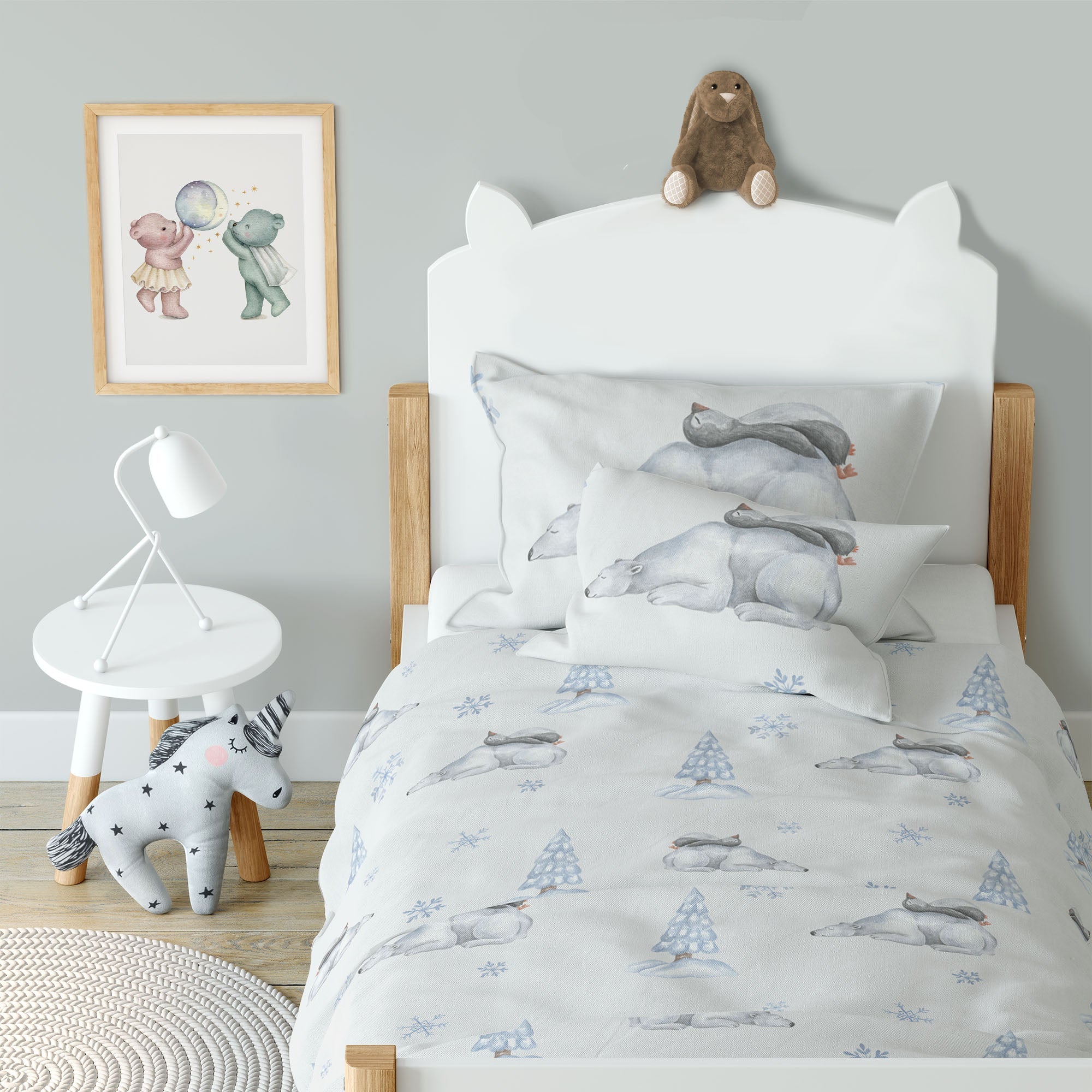 Das Leslis Kinderbettwäsche‑Set „Eisbär & Pinguin“ bringt Polarlicht‑Magie, funkelnden Schnee und kuschelige Winterstimmung direkt ins Bett – perfekt für kleine Fans von Eis und Schnee.