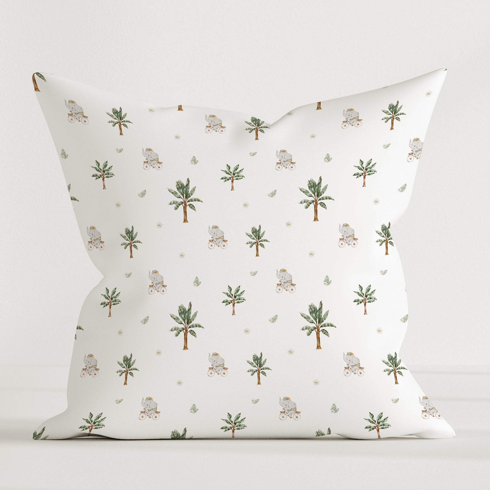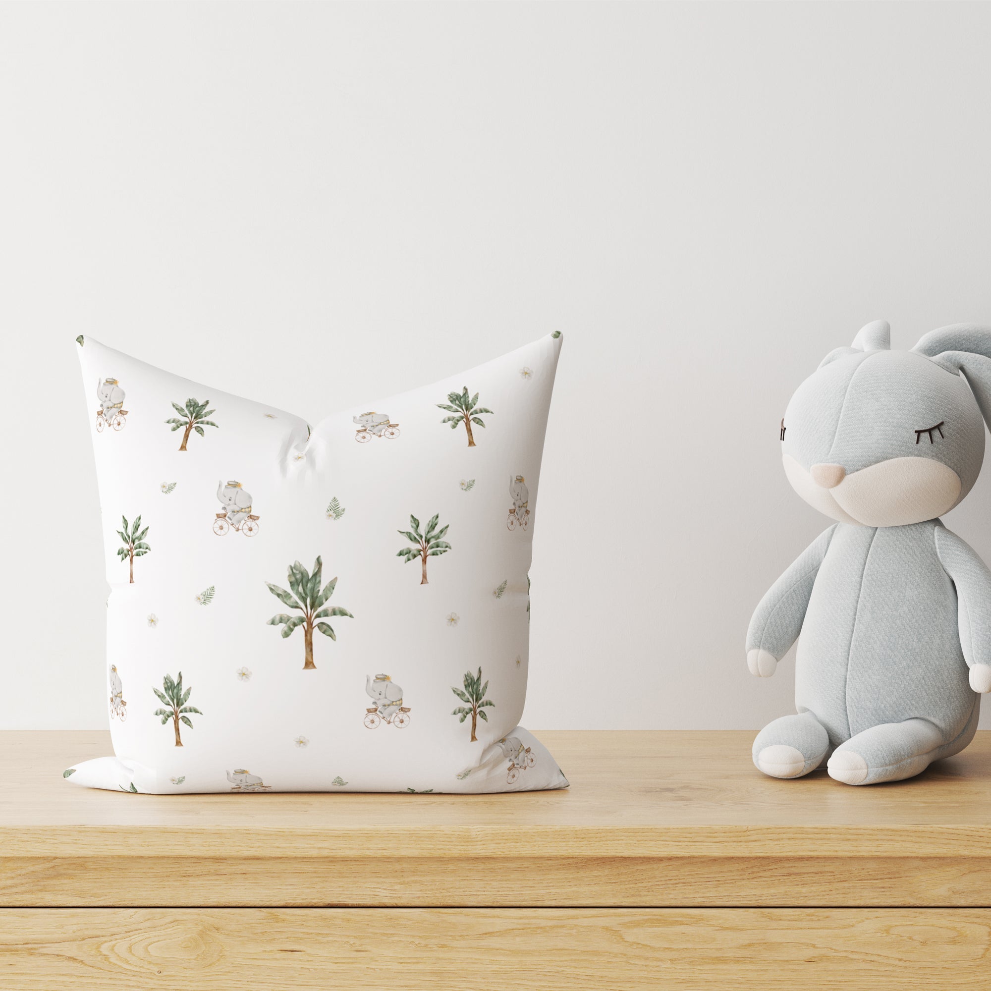 osphäre ein. Beobachte, wie majestätische Elefanten unter schattigen Palmen wandeln, und schaffe eine friedliche Umgebung im Kinderzimmer.Sanftes Safari-Abenteuer: Tauche mit dem "Elefanten und Palmen" Dekokissen in eine ruhige Dschungelatm