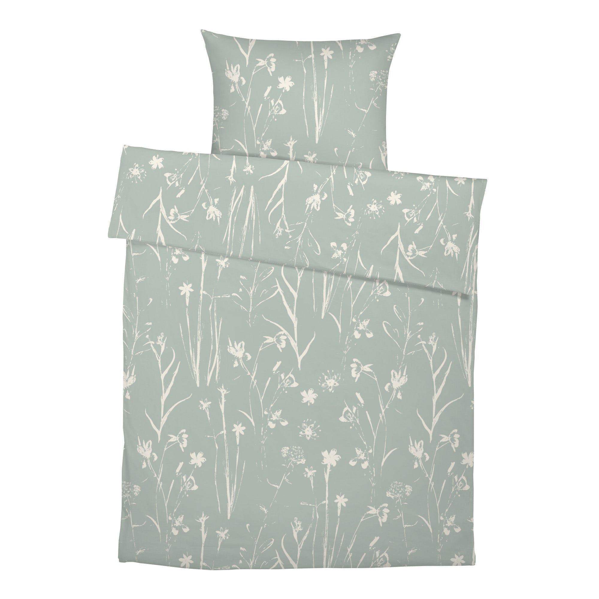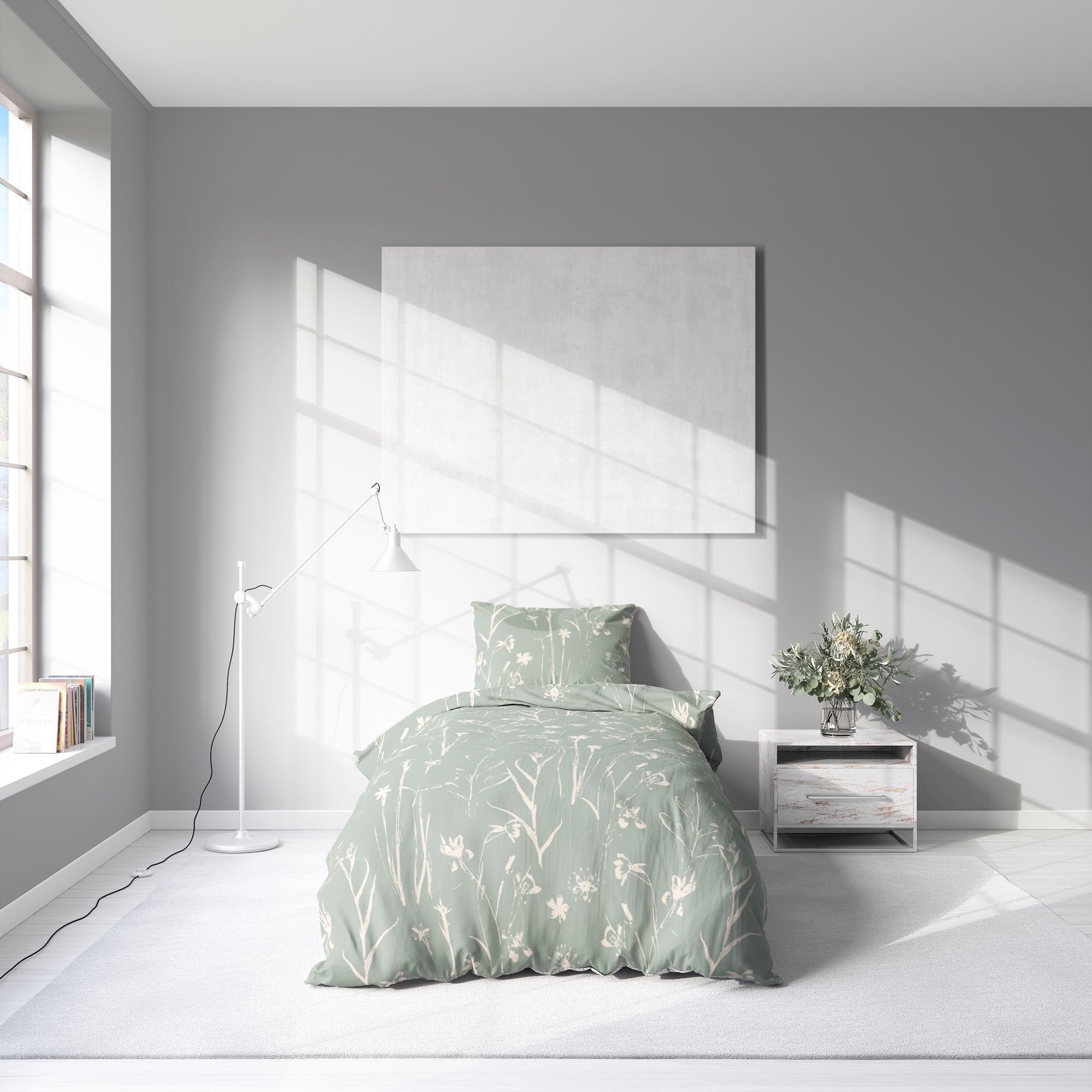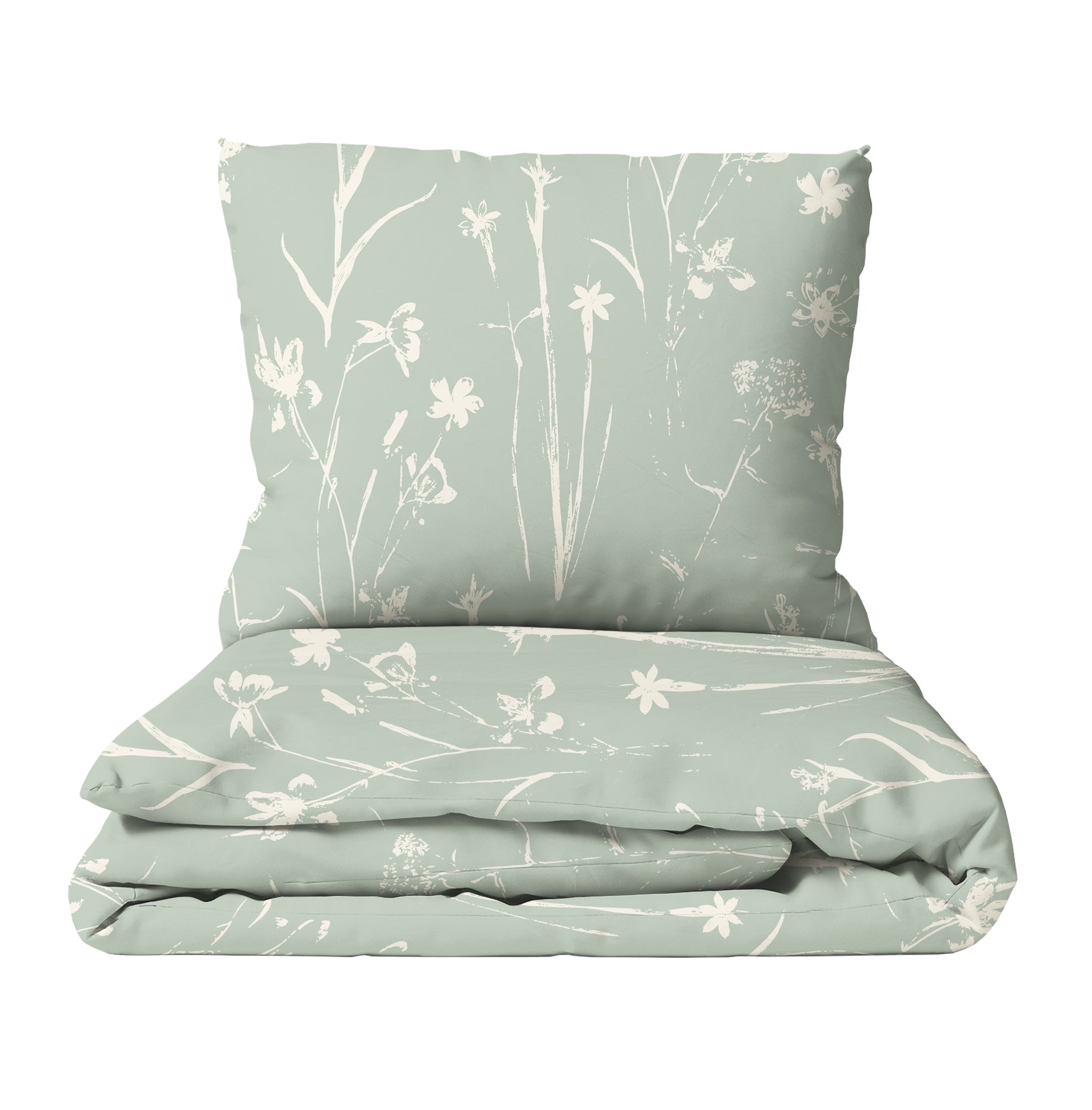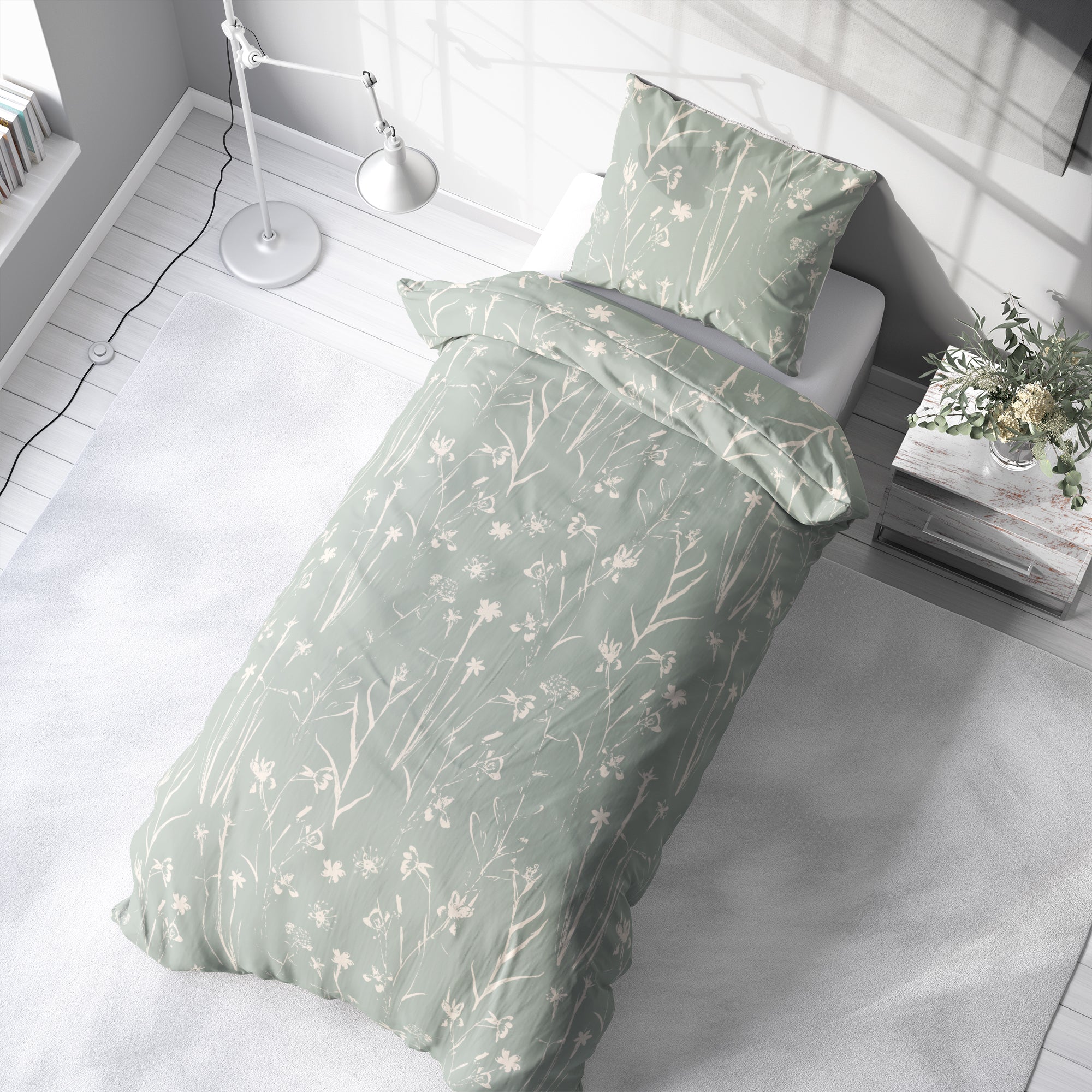 Die Bettwäsche „Grüne Wiese“ vereint sanft beige Blumen auf frischem Grün zu einer lässig‑eleganten Boho‑Ästhetik, die Ruhe und Leichtigkeit ins Schlafzimmer bringt.