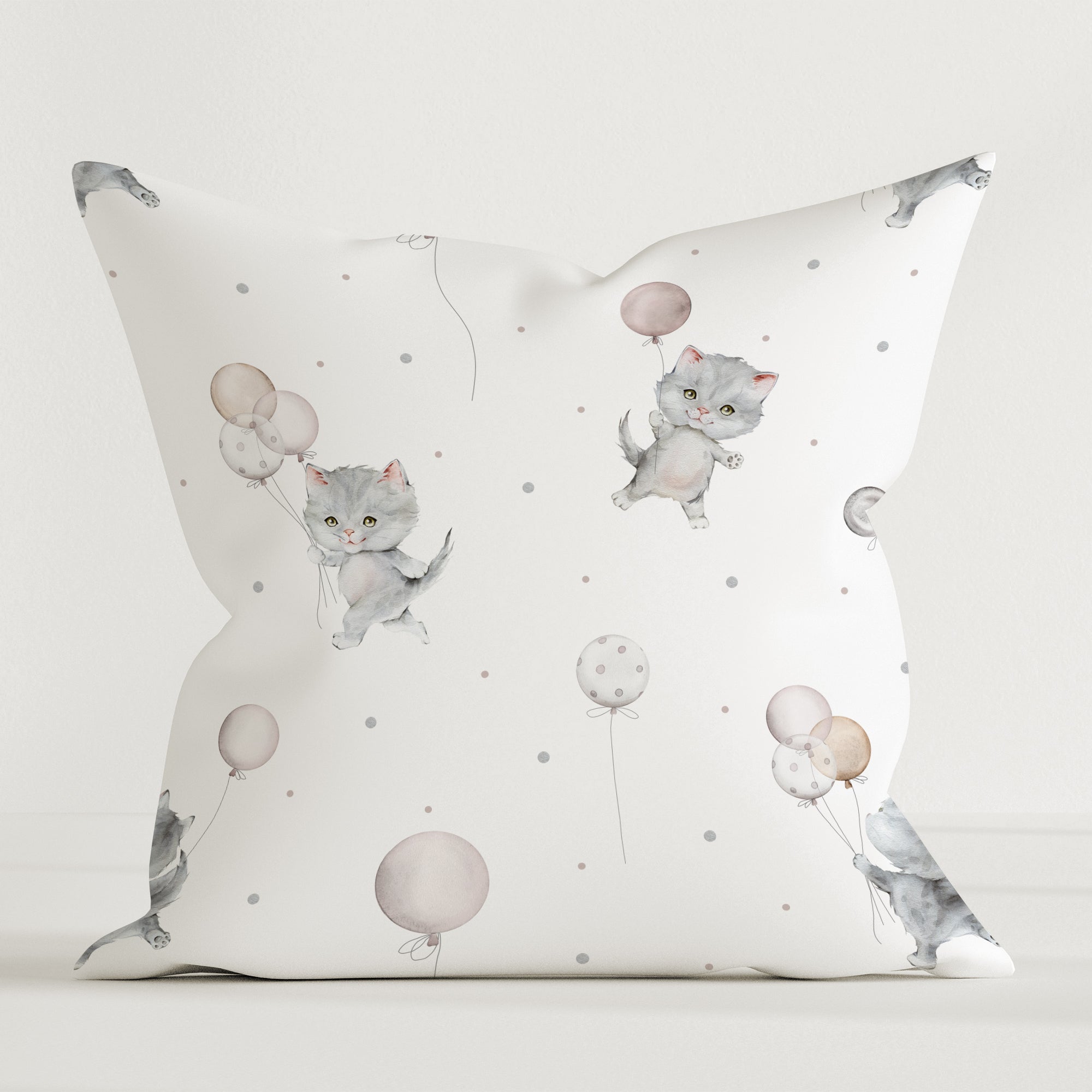 Das Katze mit Luftballons Premium Kinder Dekokissen von Leslis bringt einen Hauch von Himmelsabenteuer ins Kinderzimmer: liebevoll gezeichnete Katzen schweben mit bunten Ballons durch weiche Wolken und schaffen Geborgenheit.