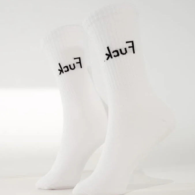 Diese Socken sind nicht einfach nur Kleidung – sie sind ein Statement für alle, die laut denken und klar auftreten. Der eingestrickte Schriftzug „.kcuF“ ist bewusst gespiegelt und sitzt mittig auf dem gerippten Schaft – subtil, aber unmissverständlich.
