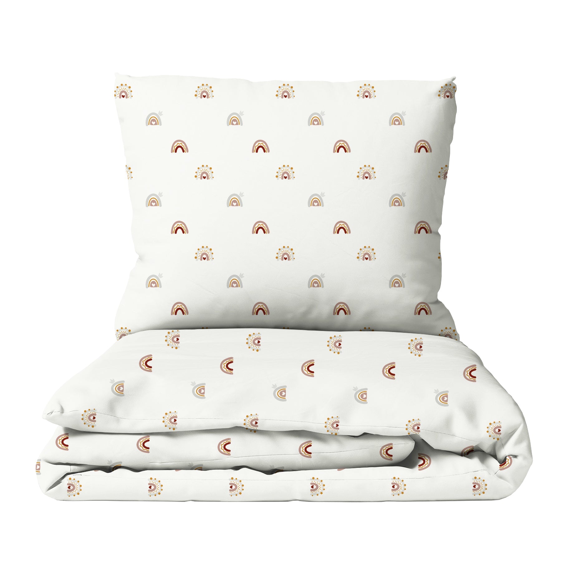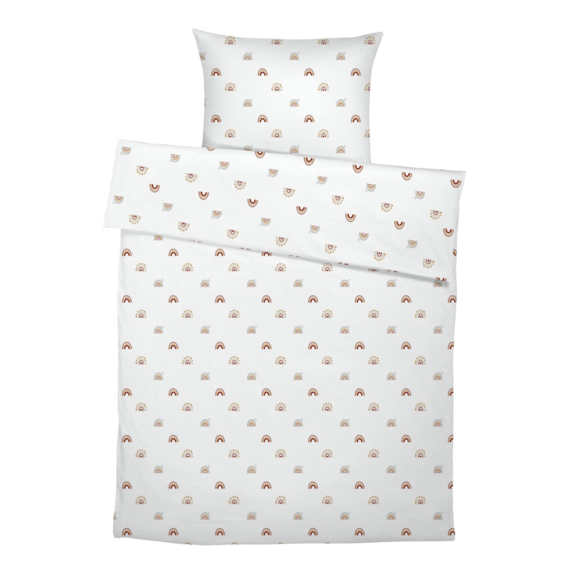 Das Kinderbettwäsche‑Set „Kleine Regenbögen“ lädt mit zarten Regenbogenmotiven in eine Welt voller Farbenfreude und Leichtigkeit ein – jede Nacht ein optimistischer Ausflug ins Traumland.